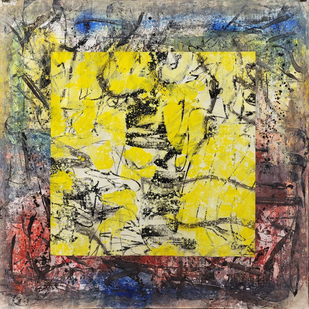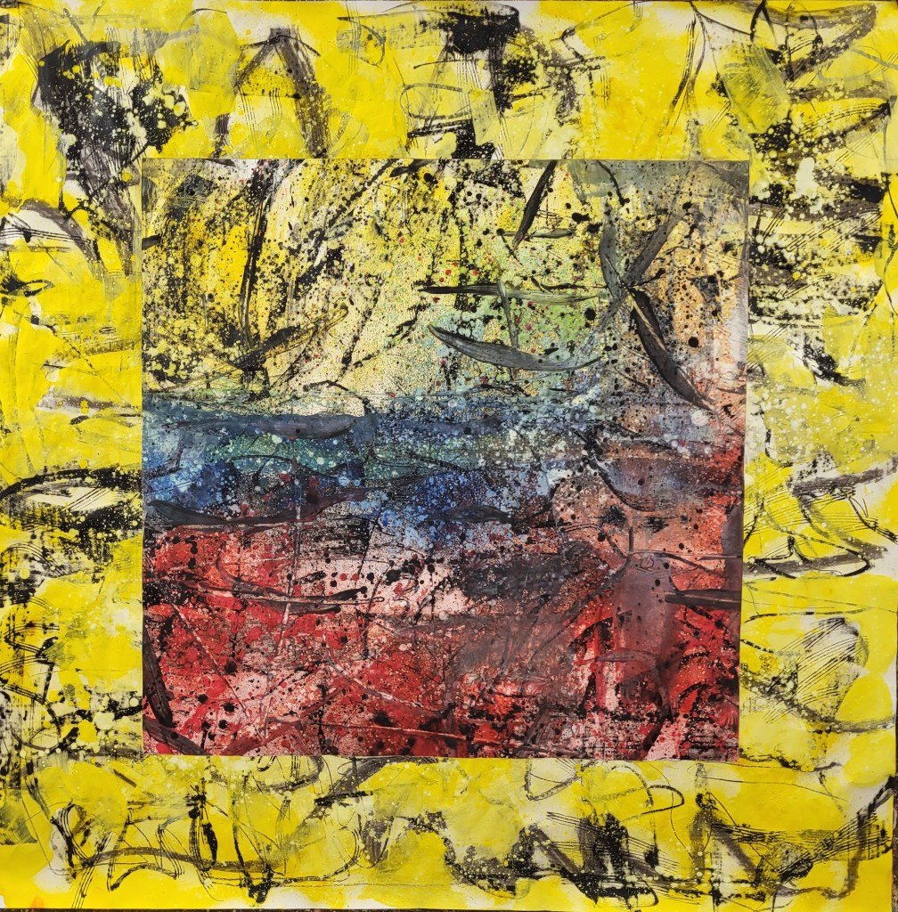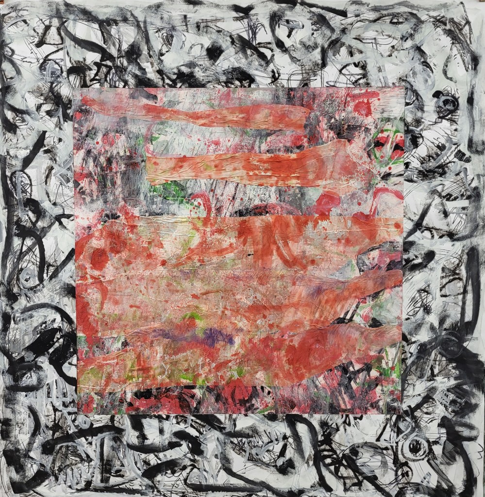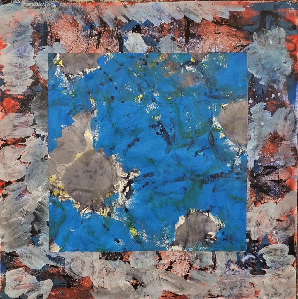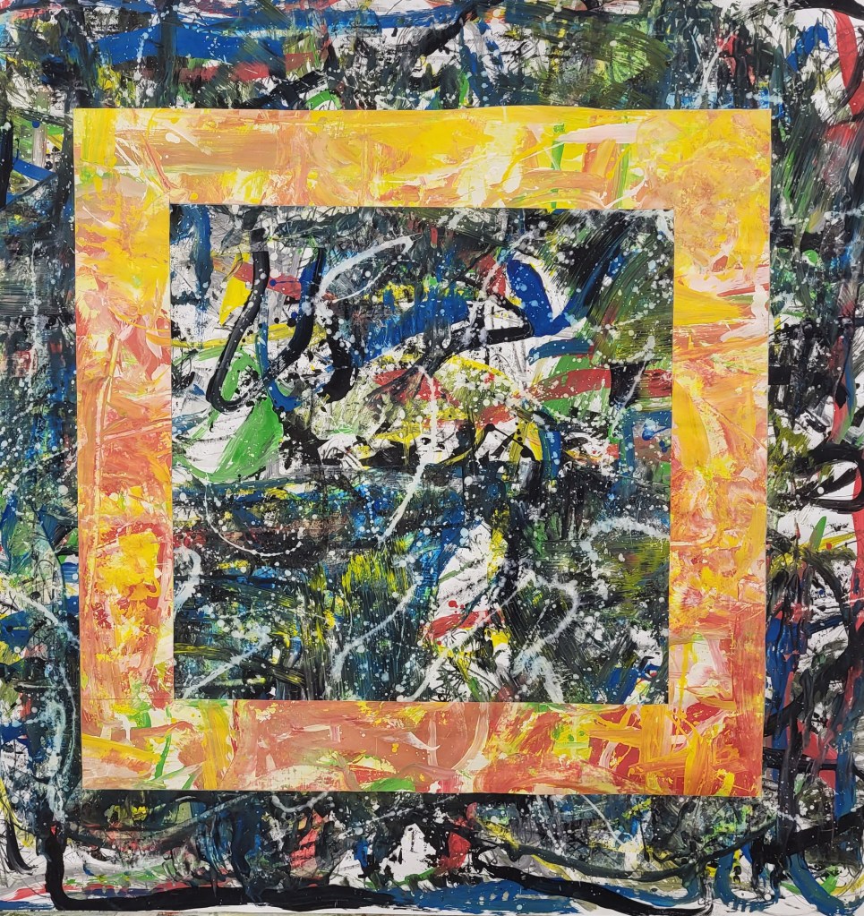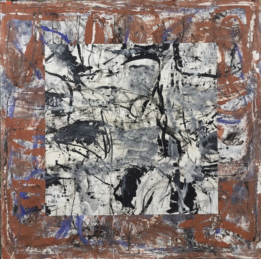 Avec découpe 150x150cm Le format carré est l’occasion d’une égalité entre le haut et le bas, avec trop de ciel, trop de sol, pour donner ma position, marquer ma présence et ne pas pouvoir tricher..