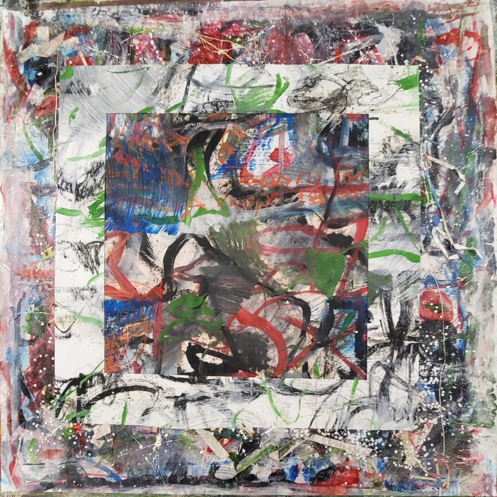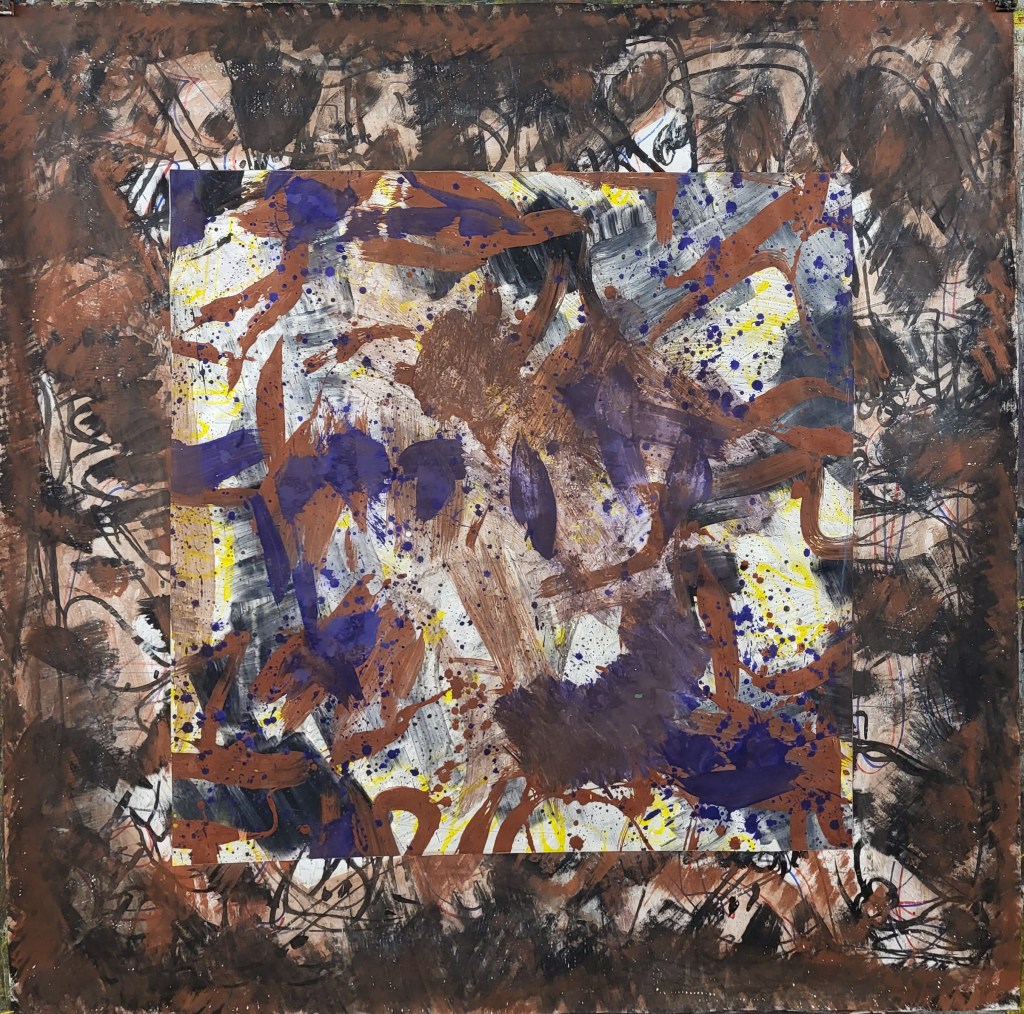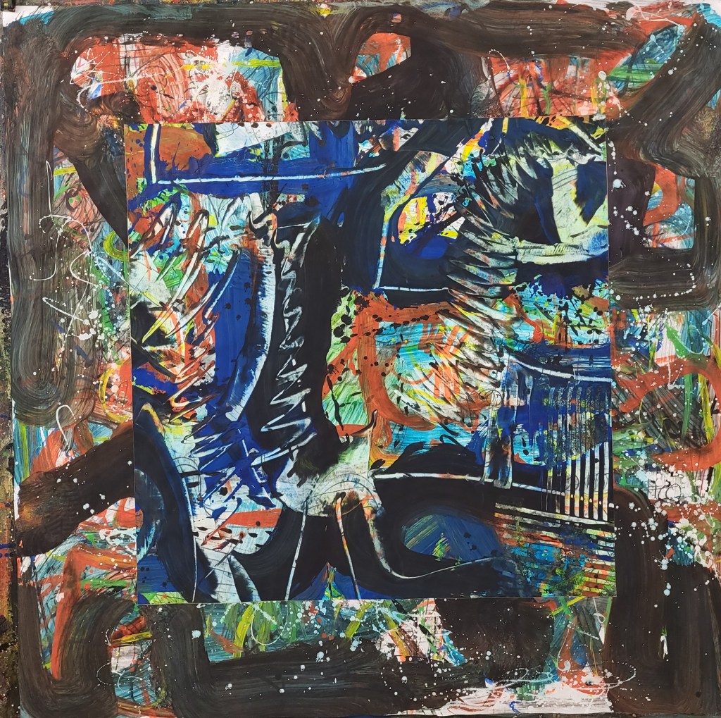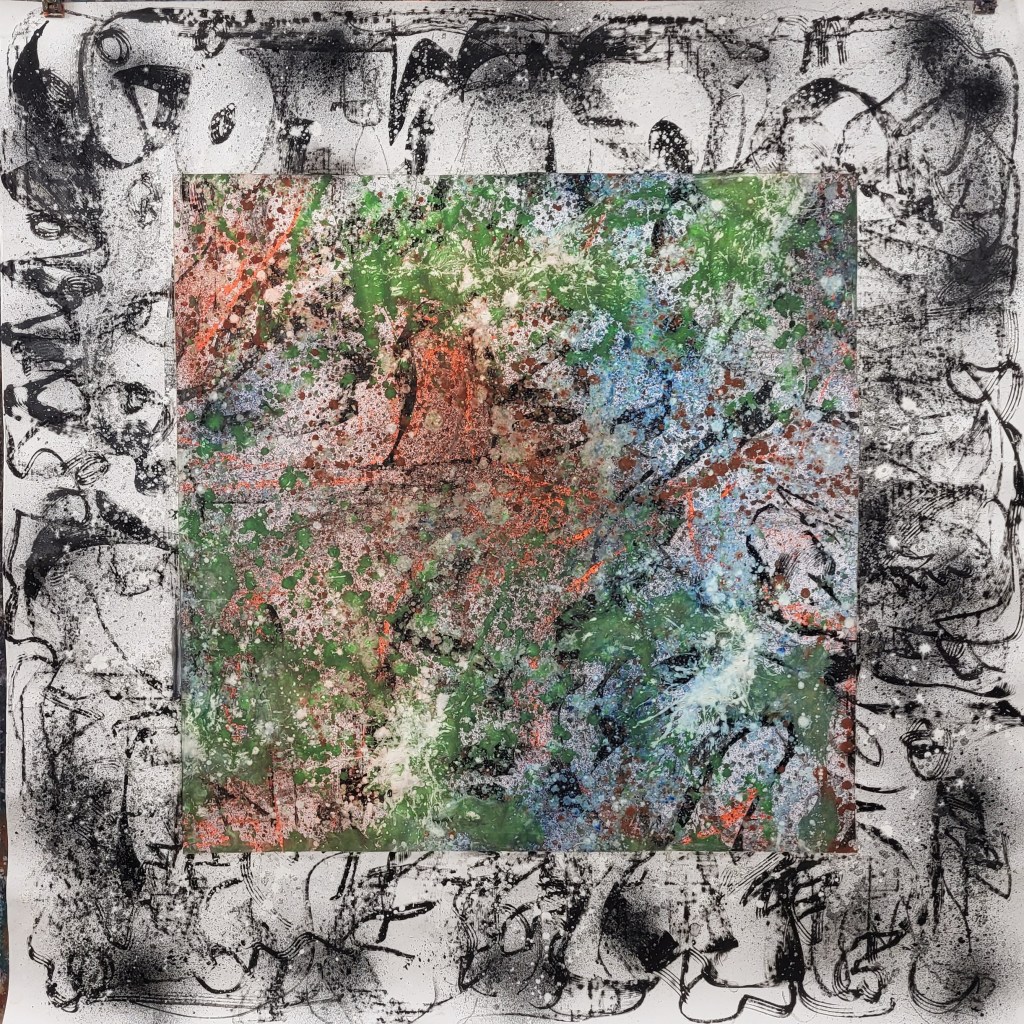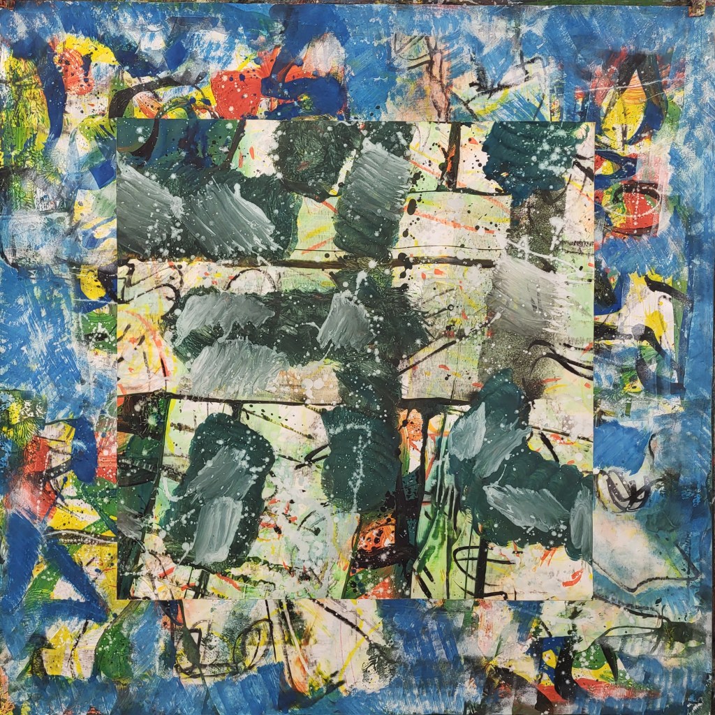 Avec découpe 150x150cm Le format carré est l’occasion d’une égalité entre le haut et le bas, avec trop de ciel, trop de sol, pour donner ma position, marquer ma présence et ne pas pouvoir tricher..