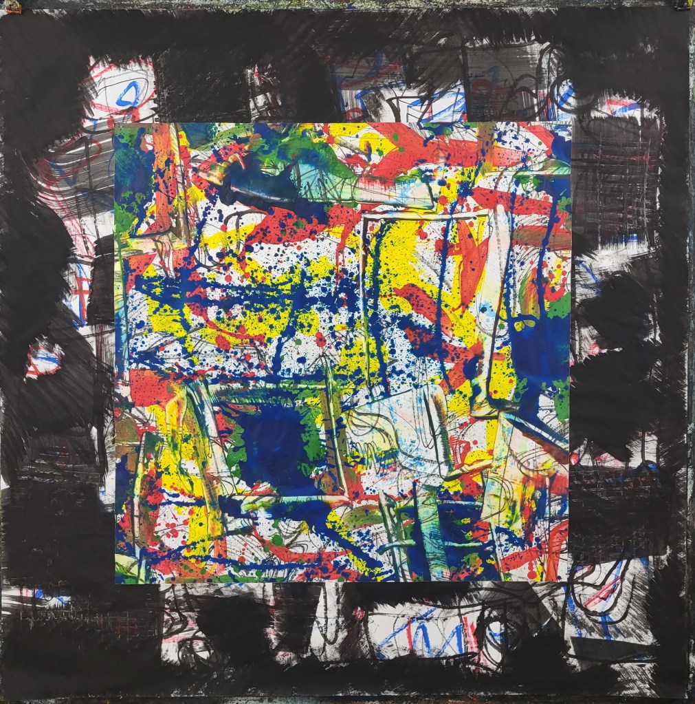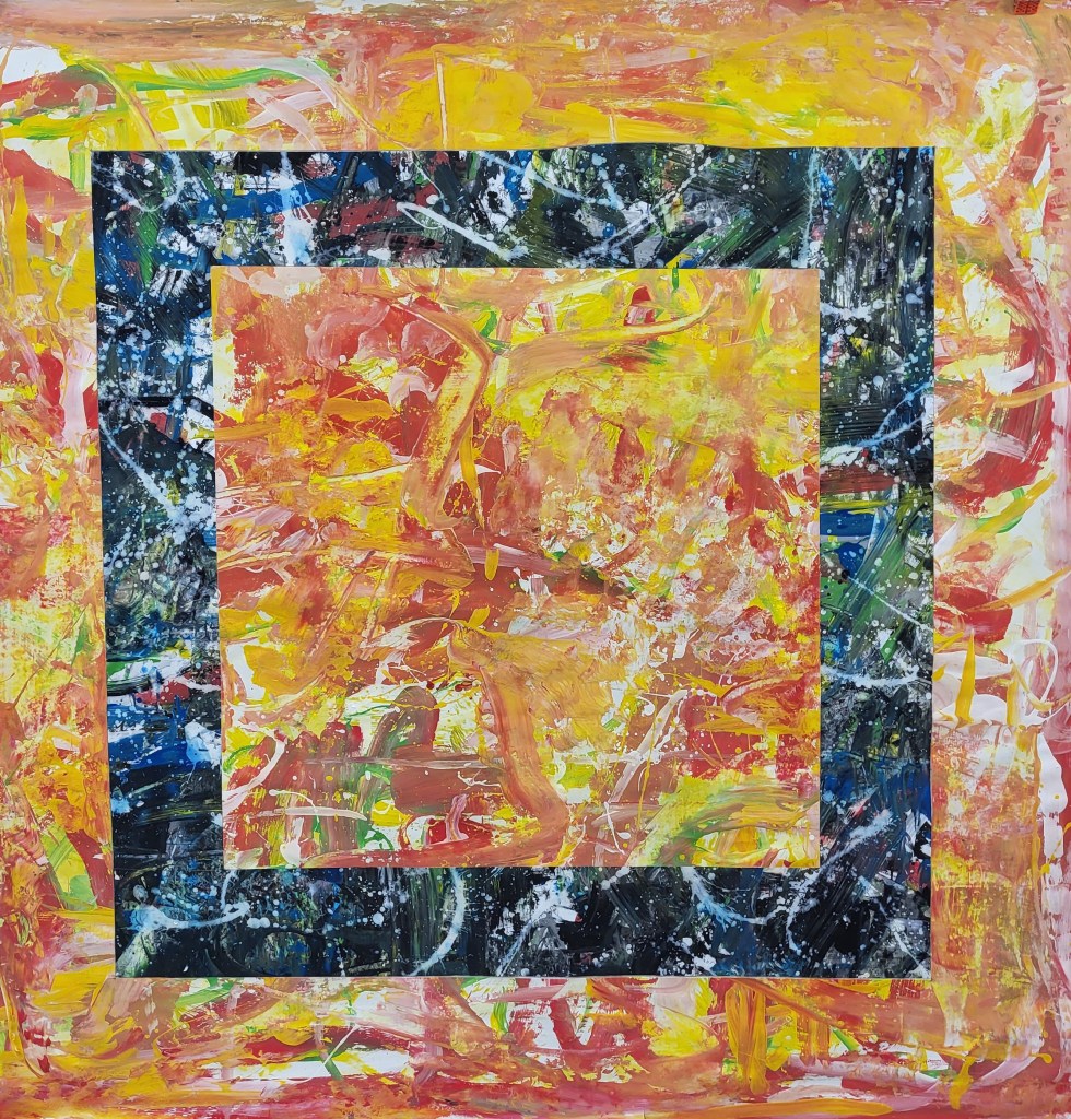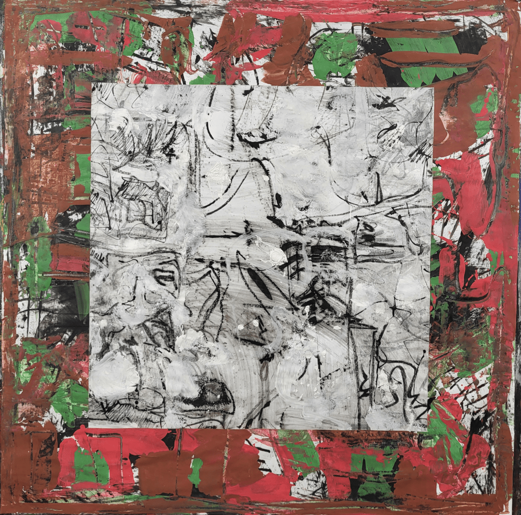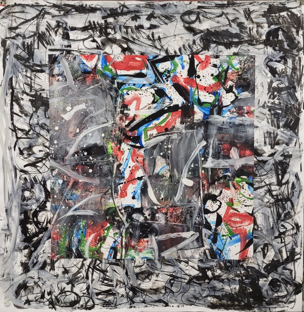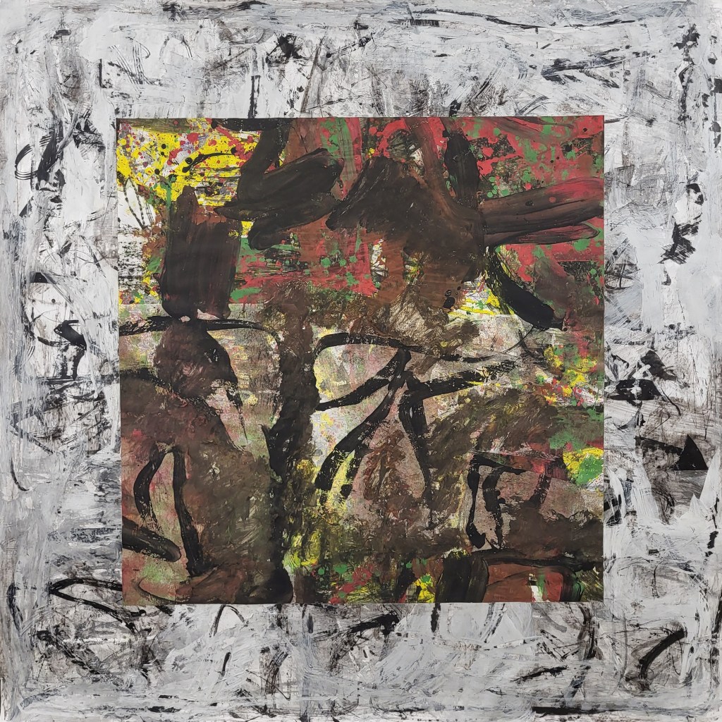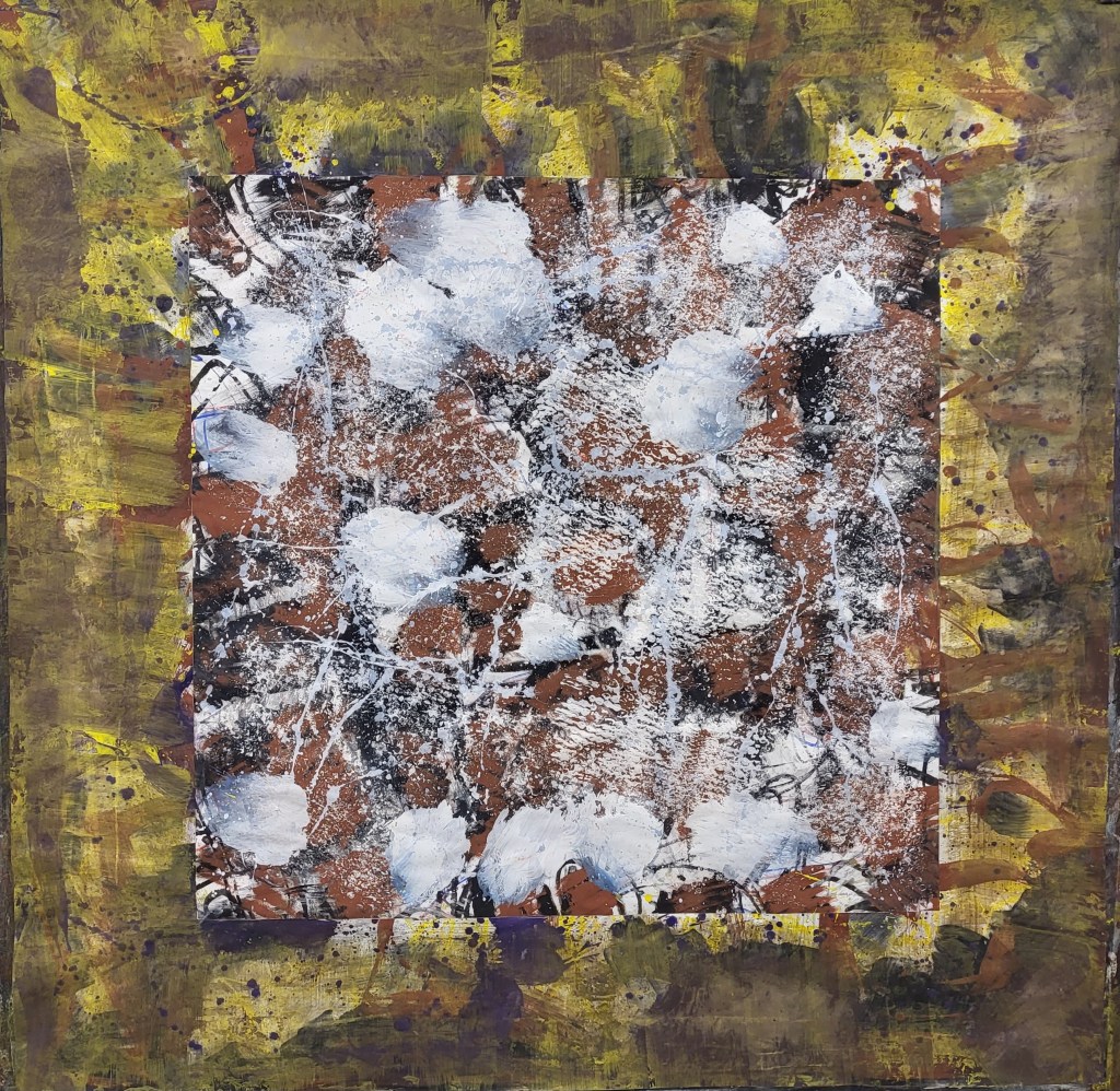 Avec découpe 150x150cm Le format carré est l’occasion d’une égalité entre le haut et le bas, avec trop de ciel, trop de sol, pour donner ma position, marquer ma présence et ne pas pouvoir tricher..