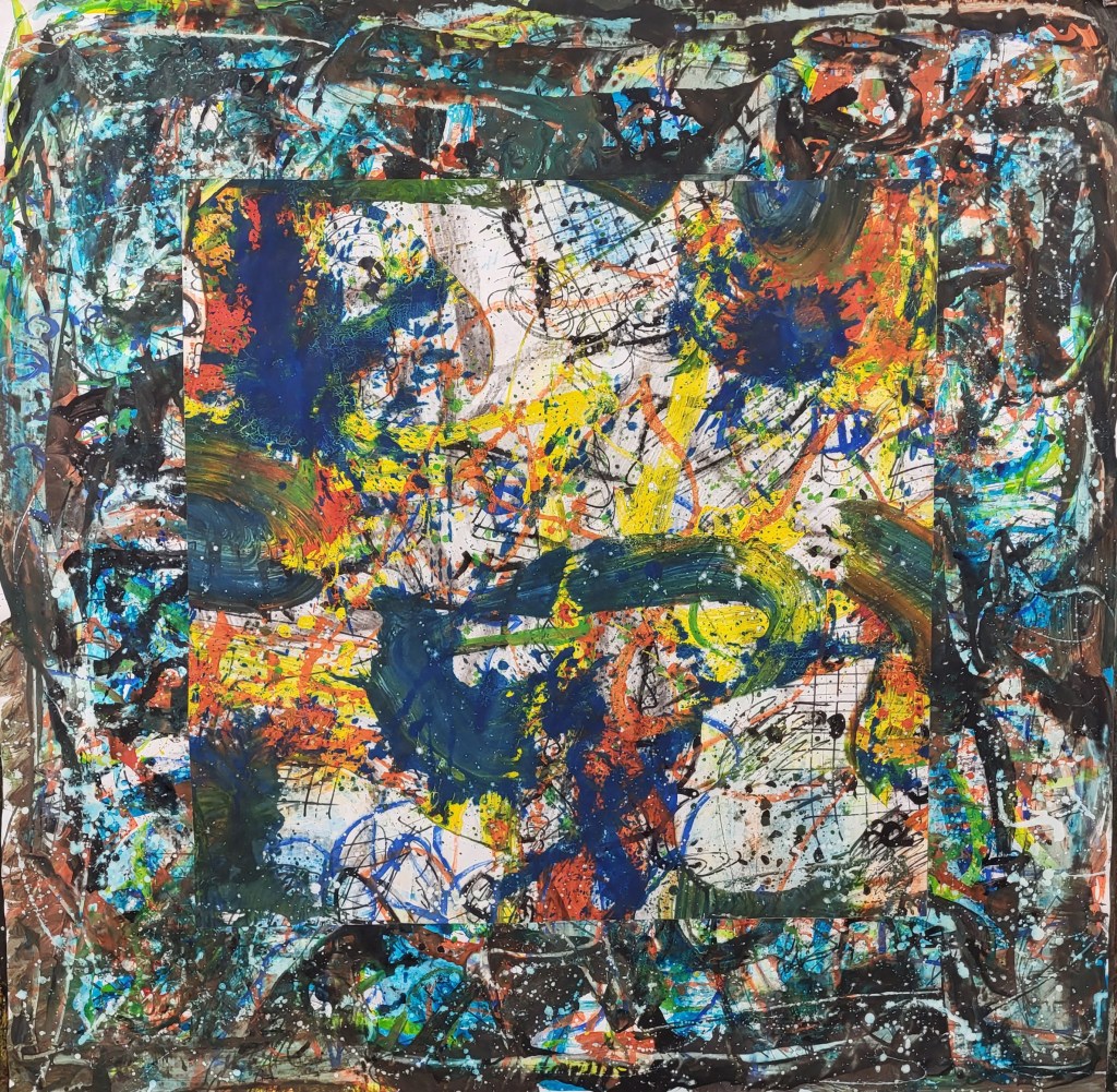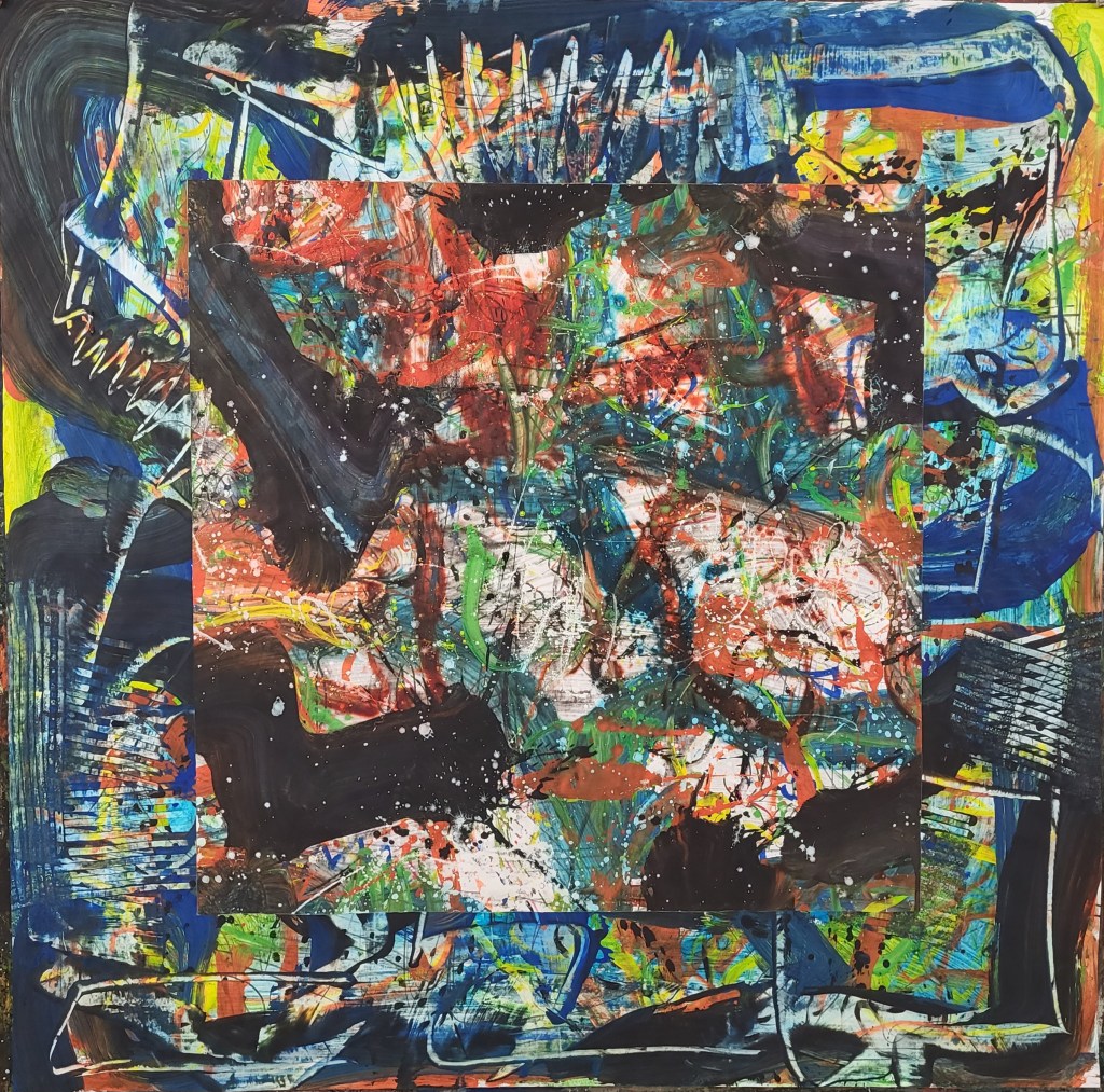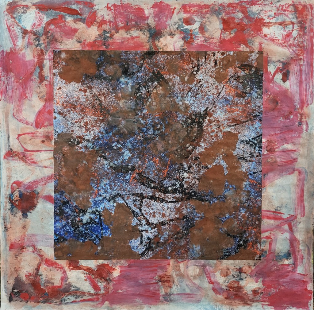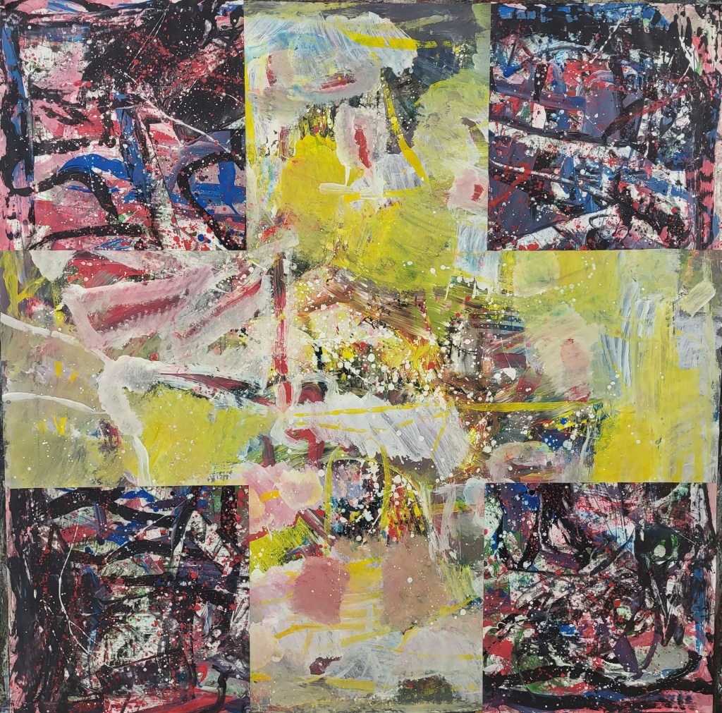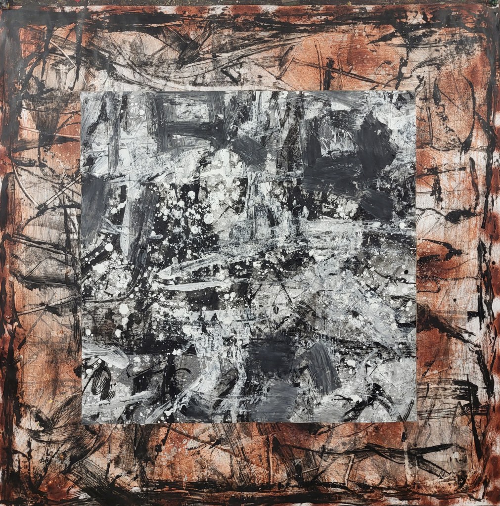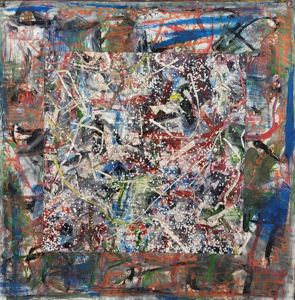 Avec découpe 150x150cm Le format carré est l’occasion d’une égalité entre le haut et le bas, avec trop de ciel, trop de sol, pour donner ma position, marquer ma présence et ne pas pouvoir tricher..