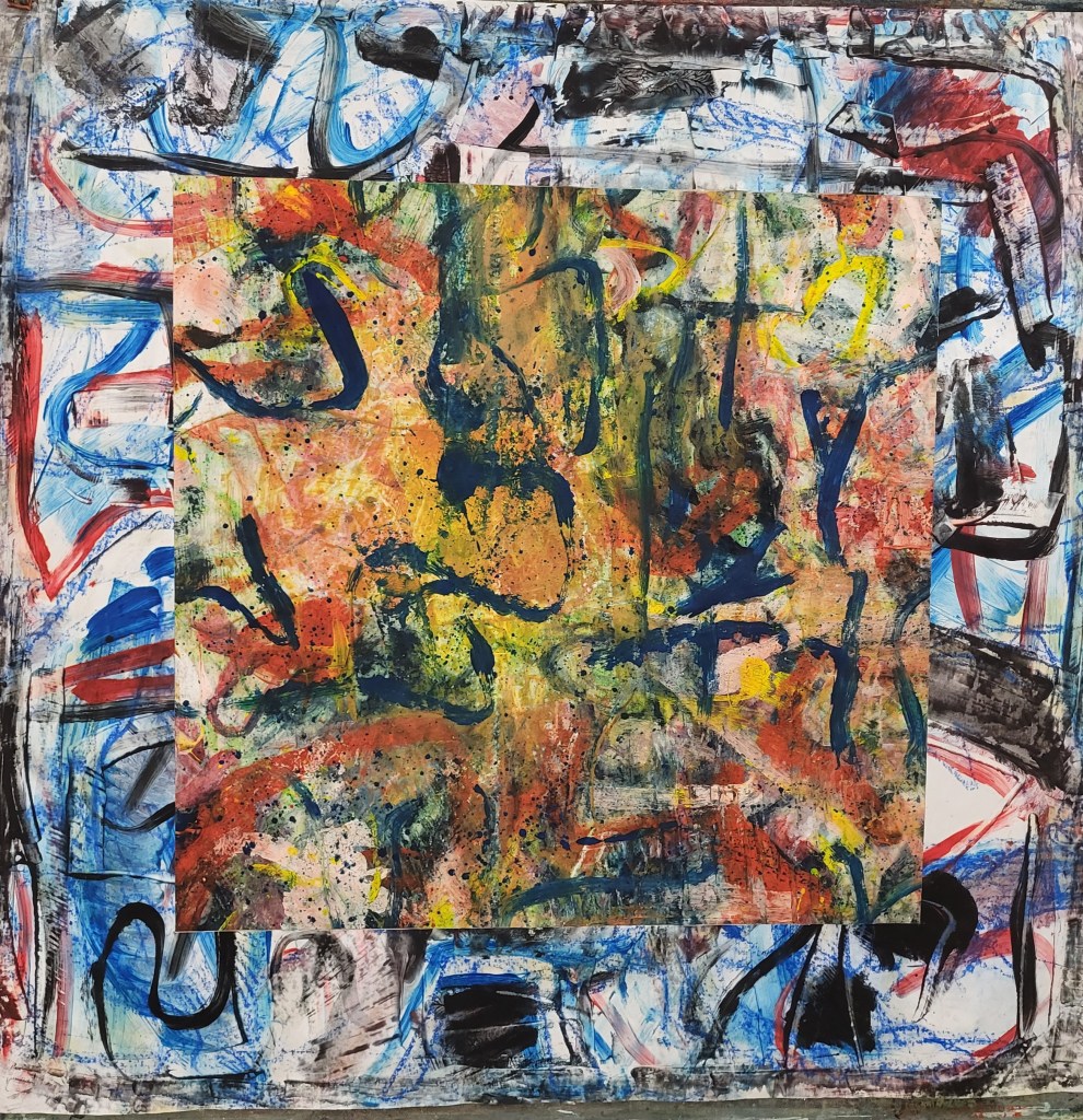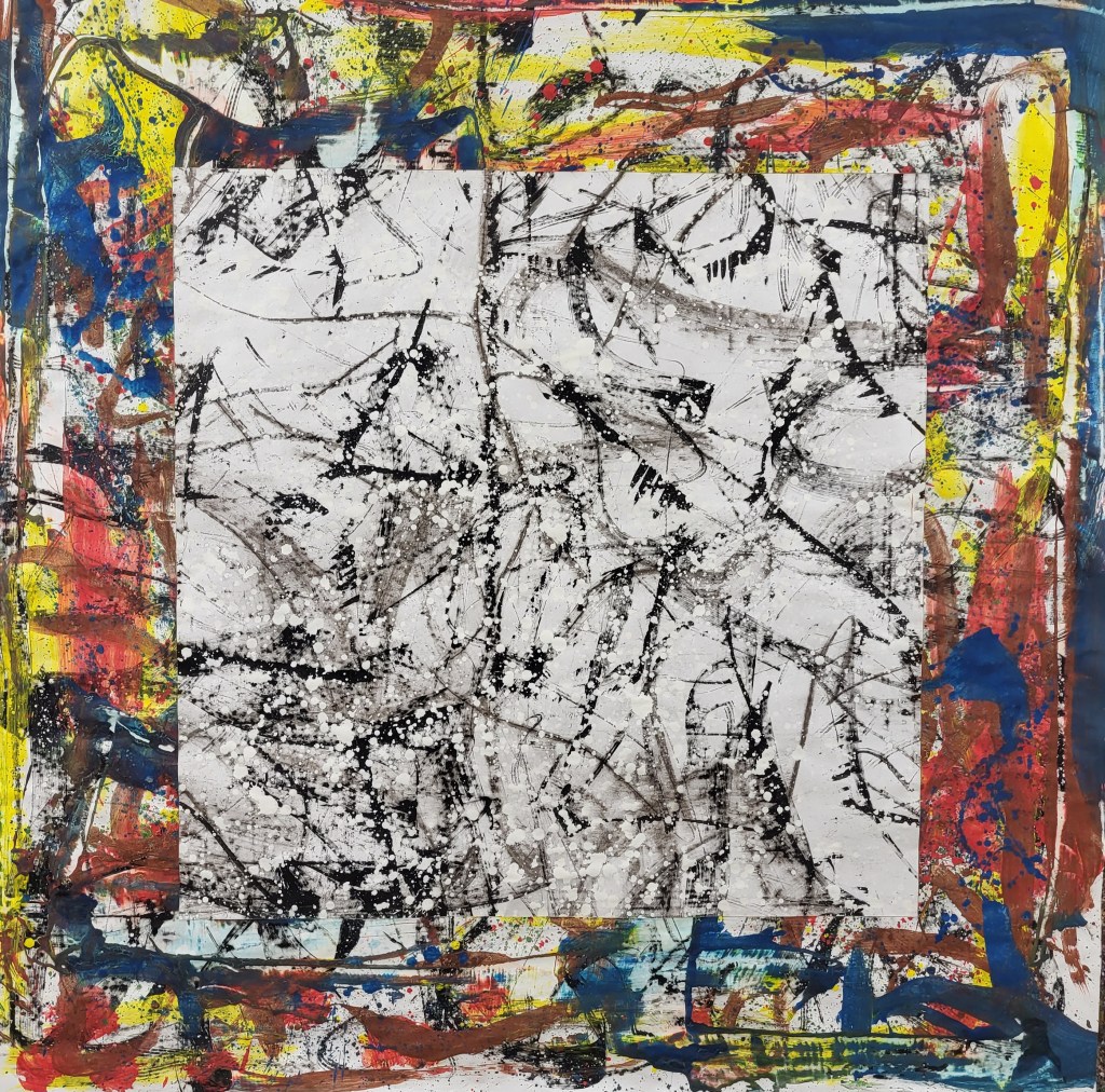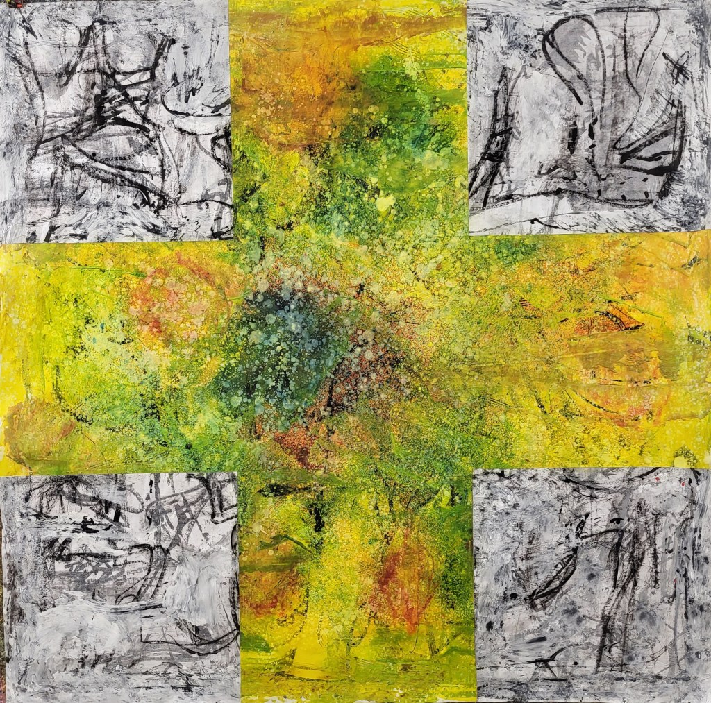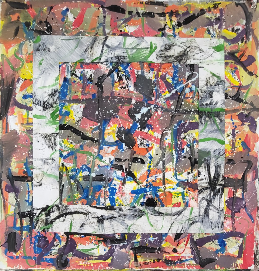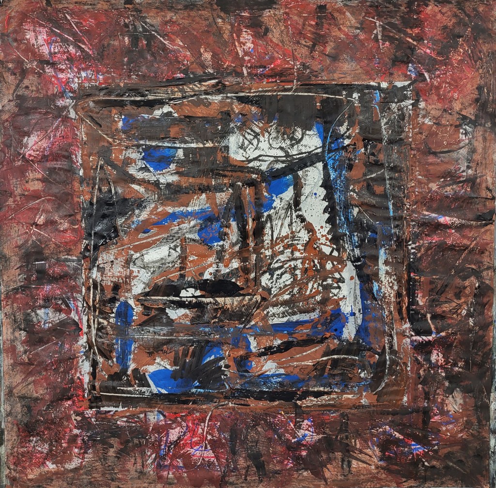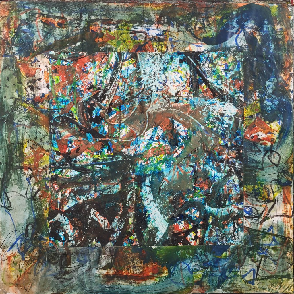 Avec découpe 150x150cm Le format carré est l’occasion d’une égalité entre le haut et le bas, avec trop de ciel, trop de sol, pour donner ma position, marquer ma présence et ne pas pouvoir tricher..