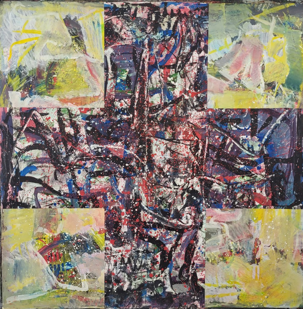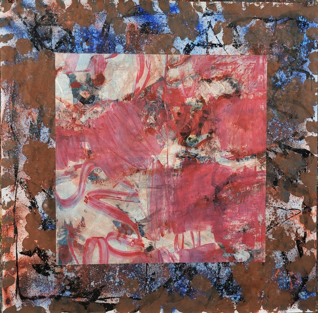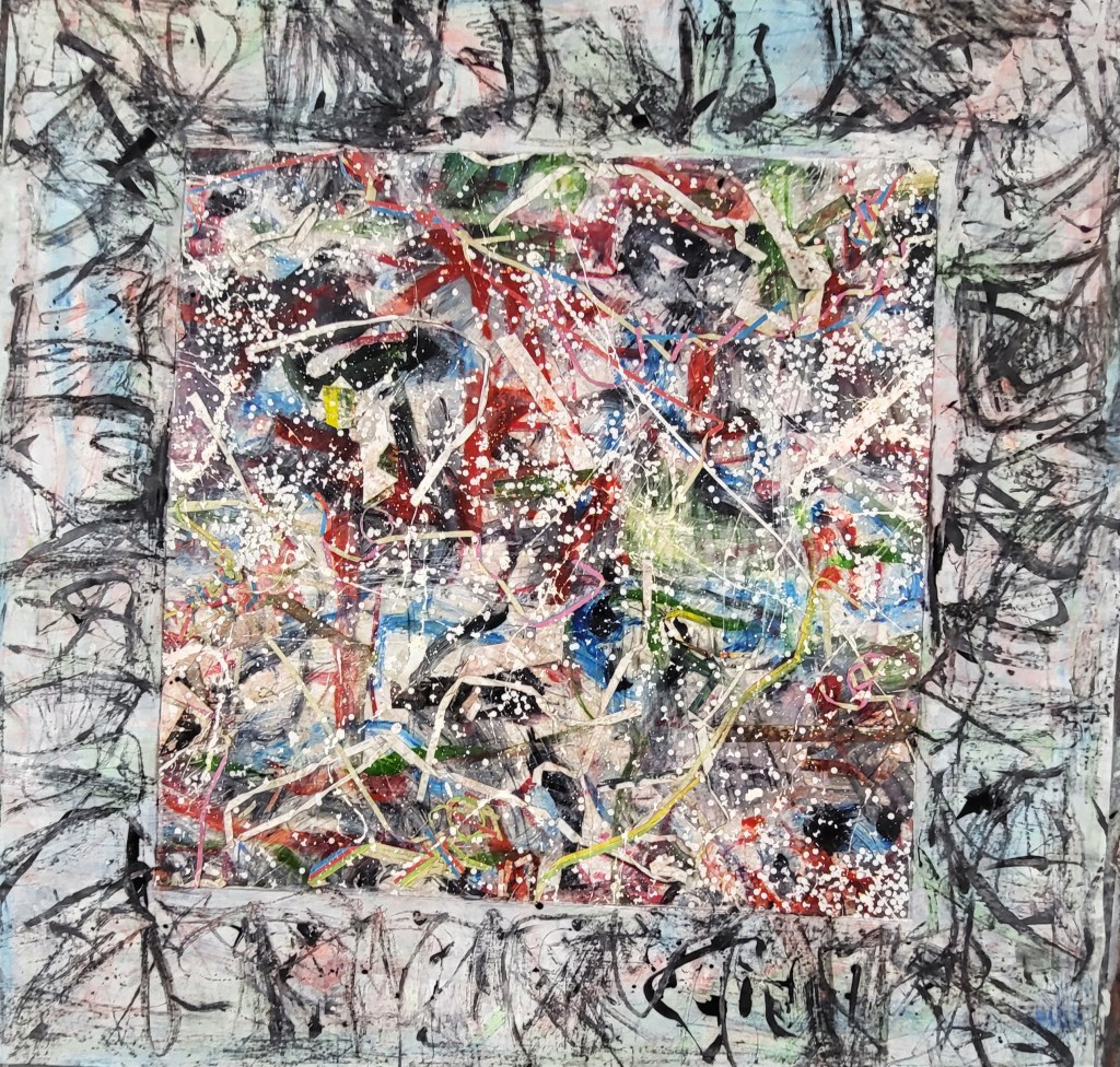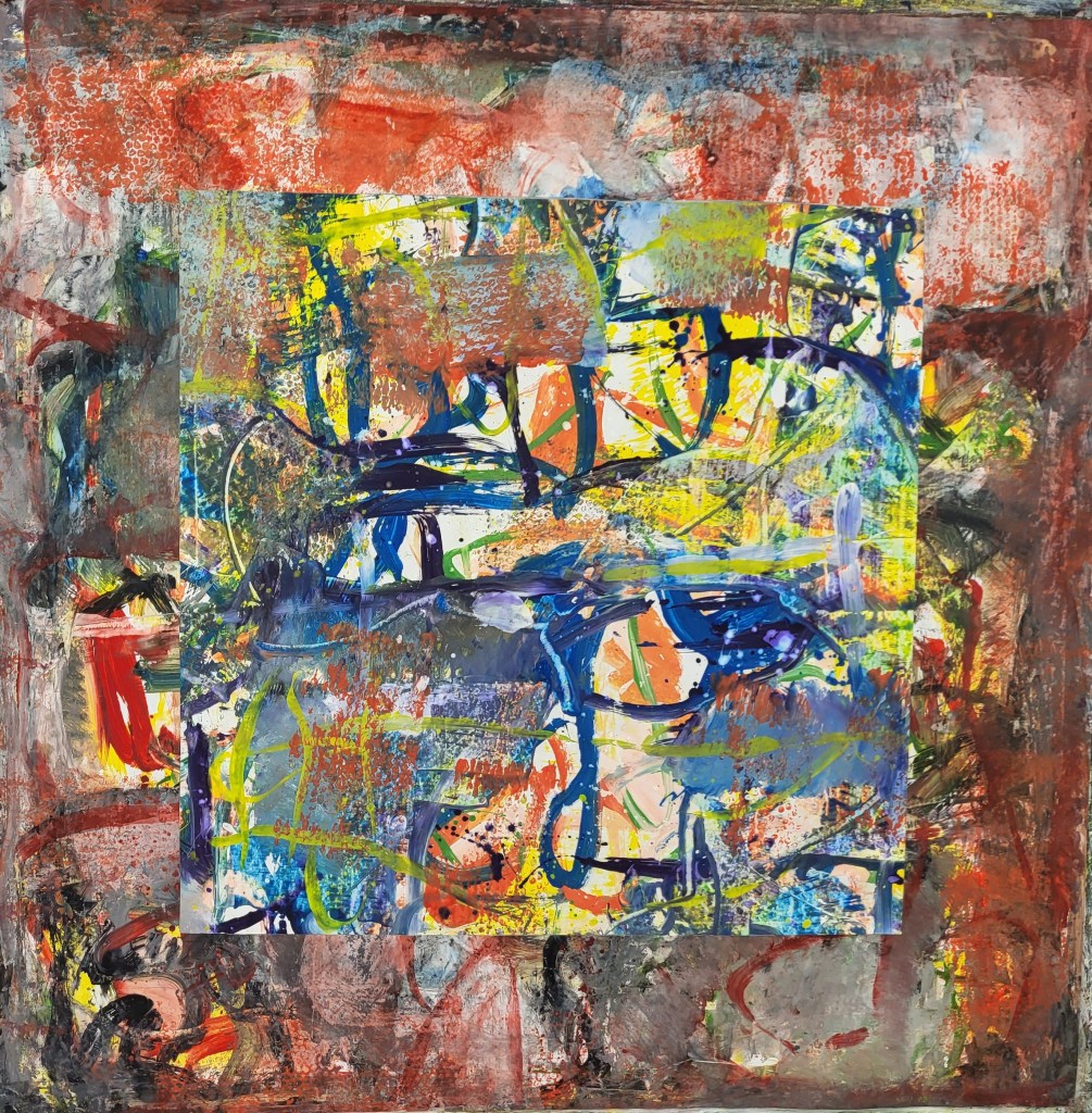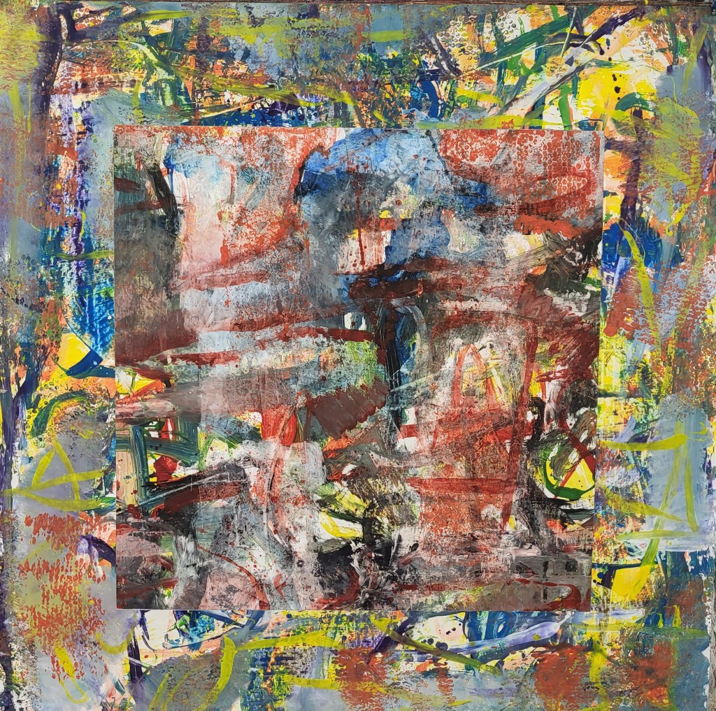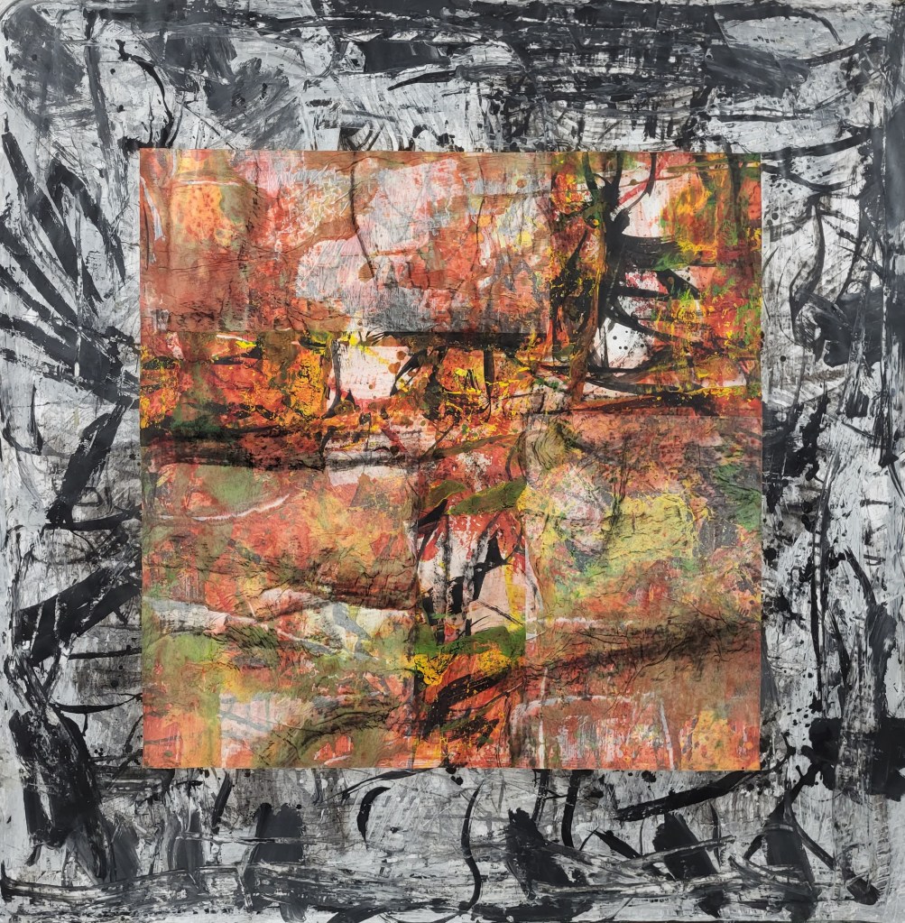 Avec découpe 150x150cm Le format carré est l’occasion d’une égalité entre le haut et le bas, avec trop de ciel, trop de sol, pour donner ma position, marquer ma présence et ne pas pouvoir tricher..