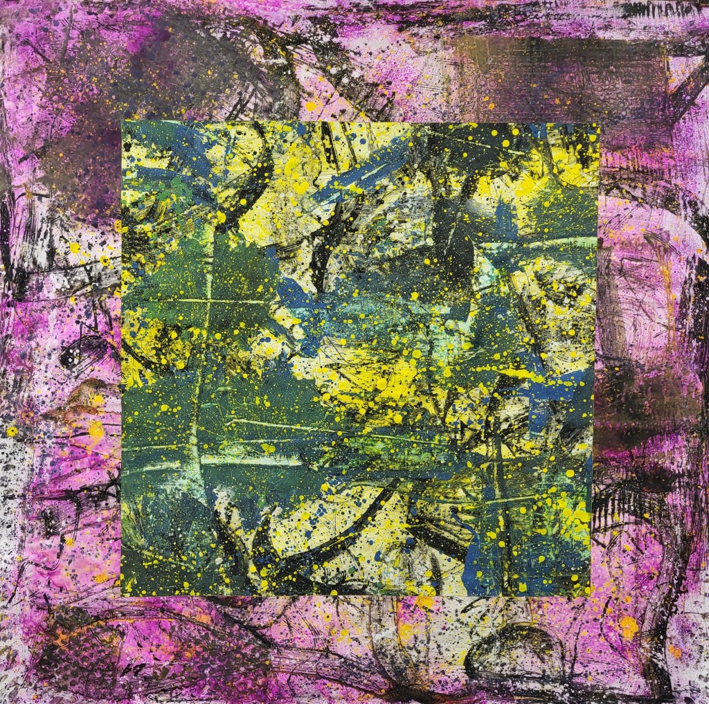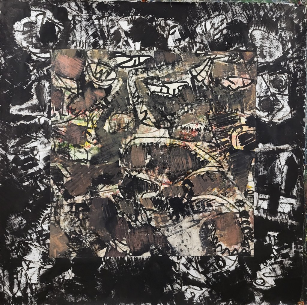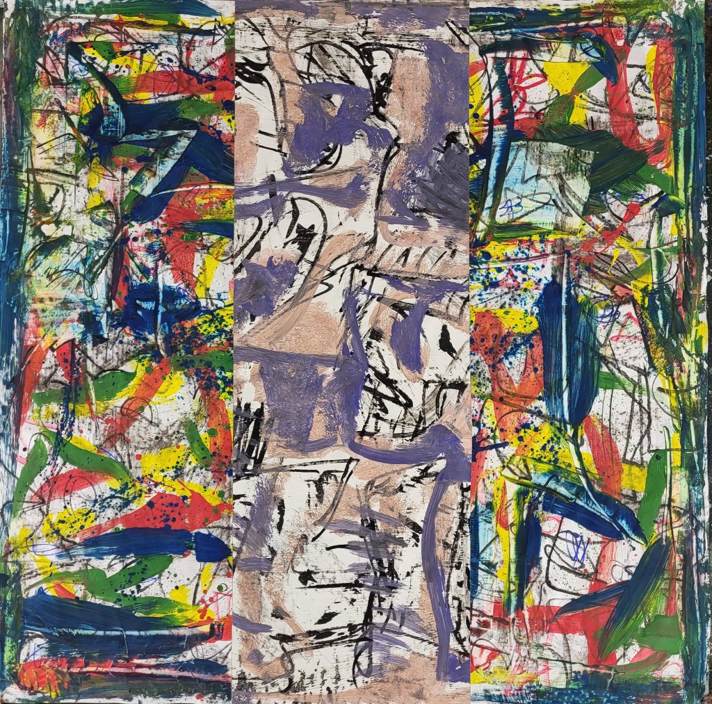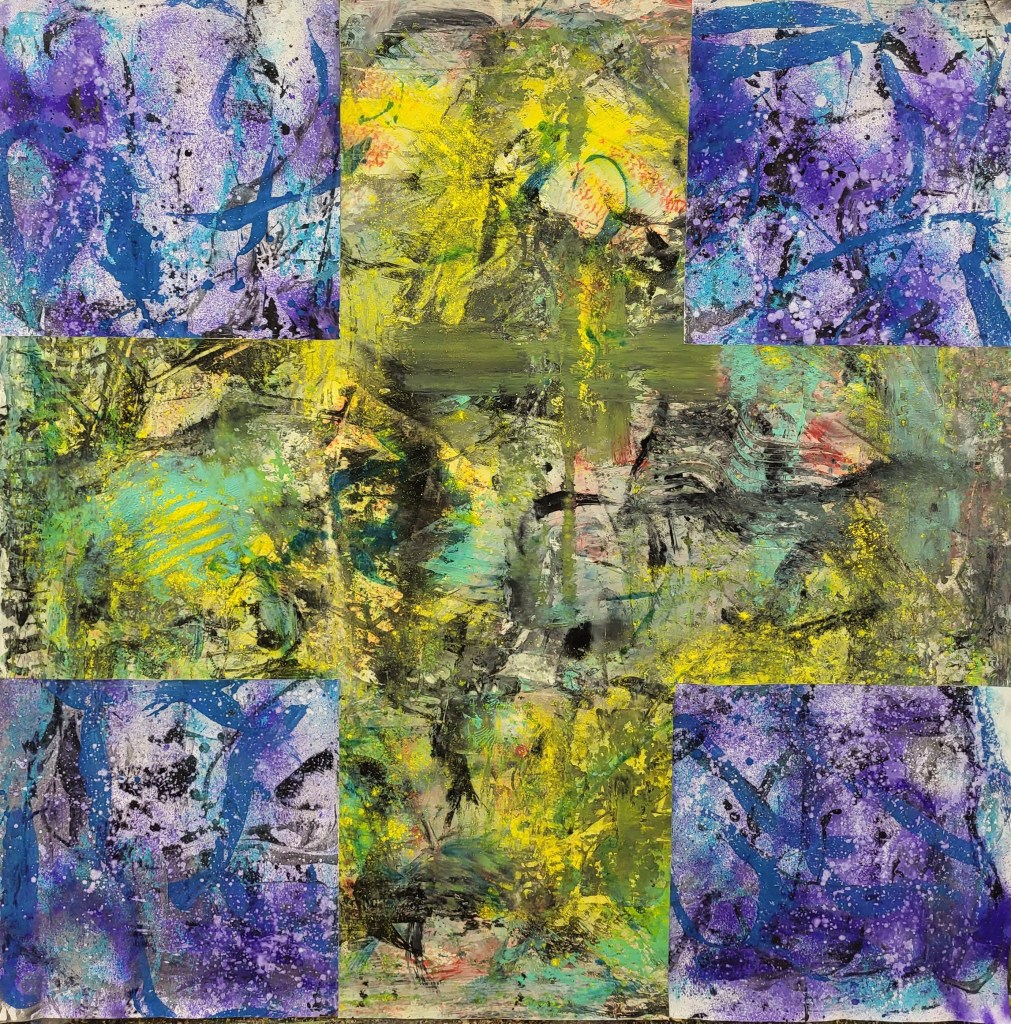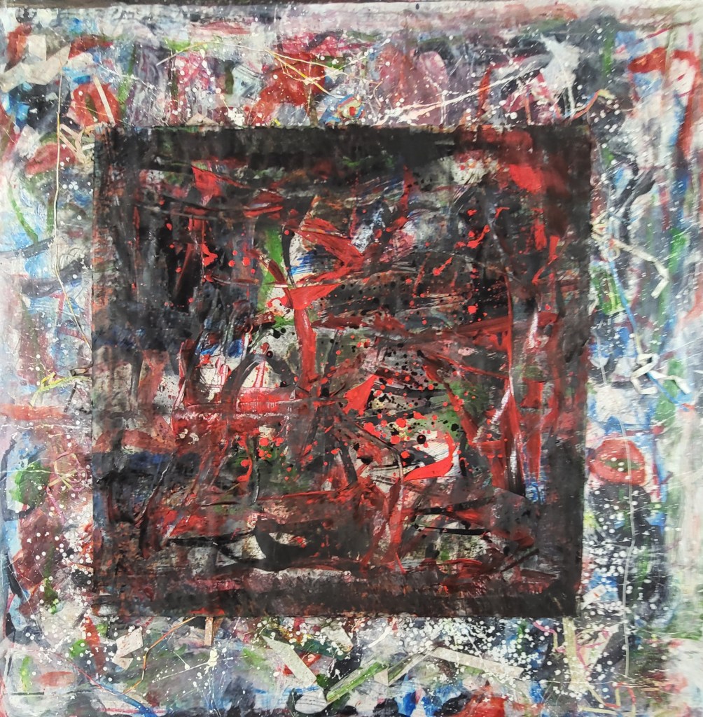 Avec découpe 150x150cm Le format carré est l’occasion d’une égalité entre le haut et le bas, avec trop de ciel, trop de sol, pour donner ma position, marquer ma présence et ne pas pouvoir tricher..