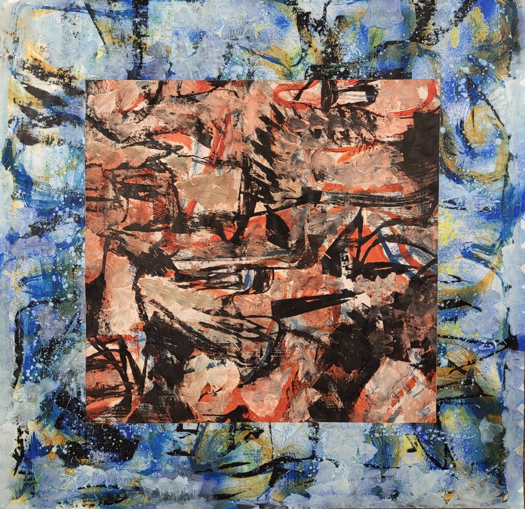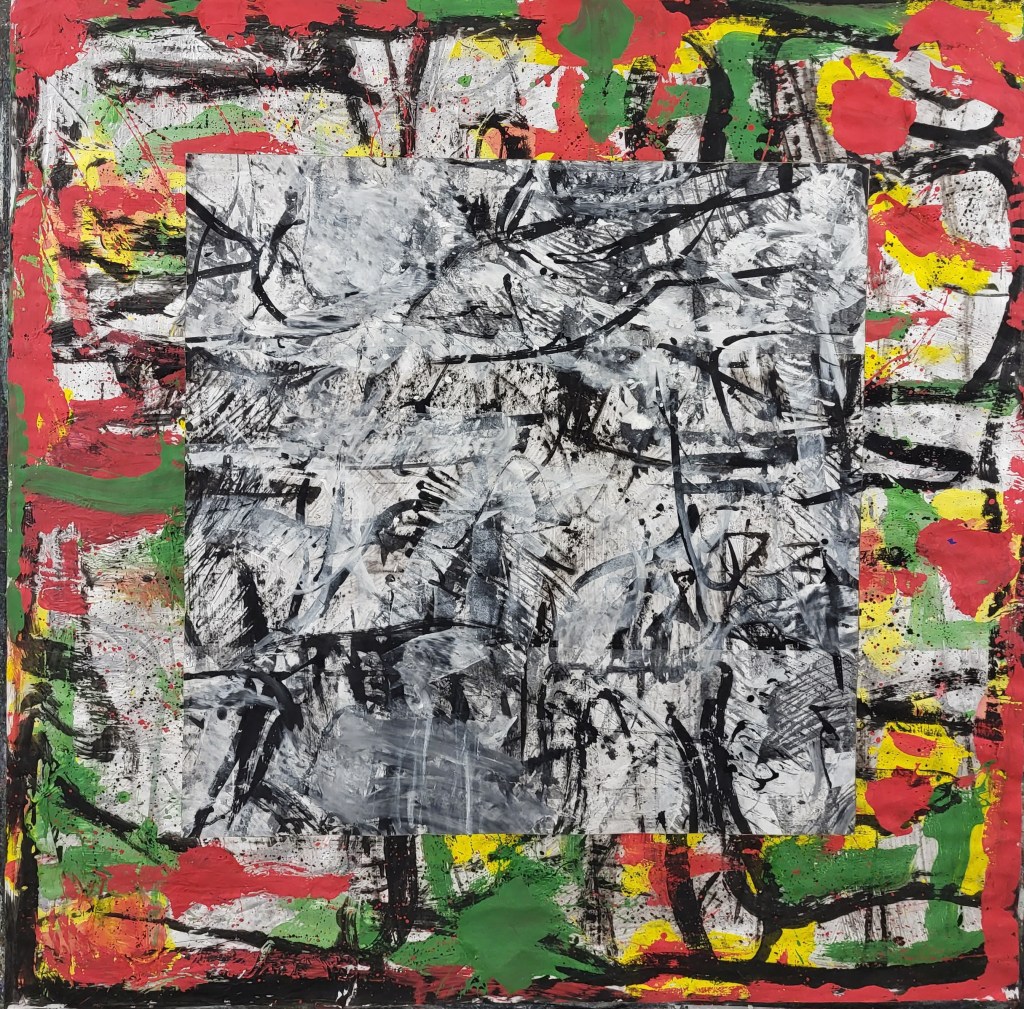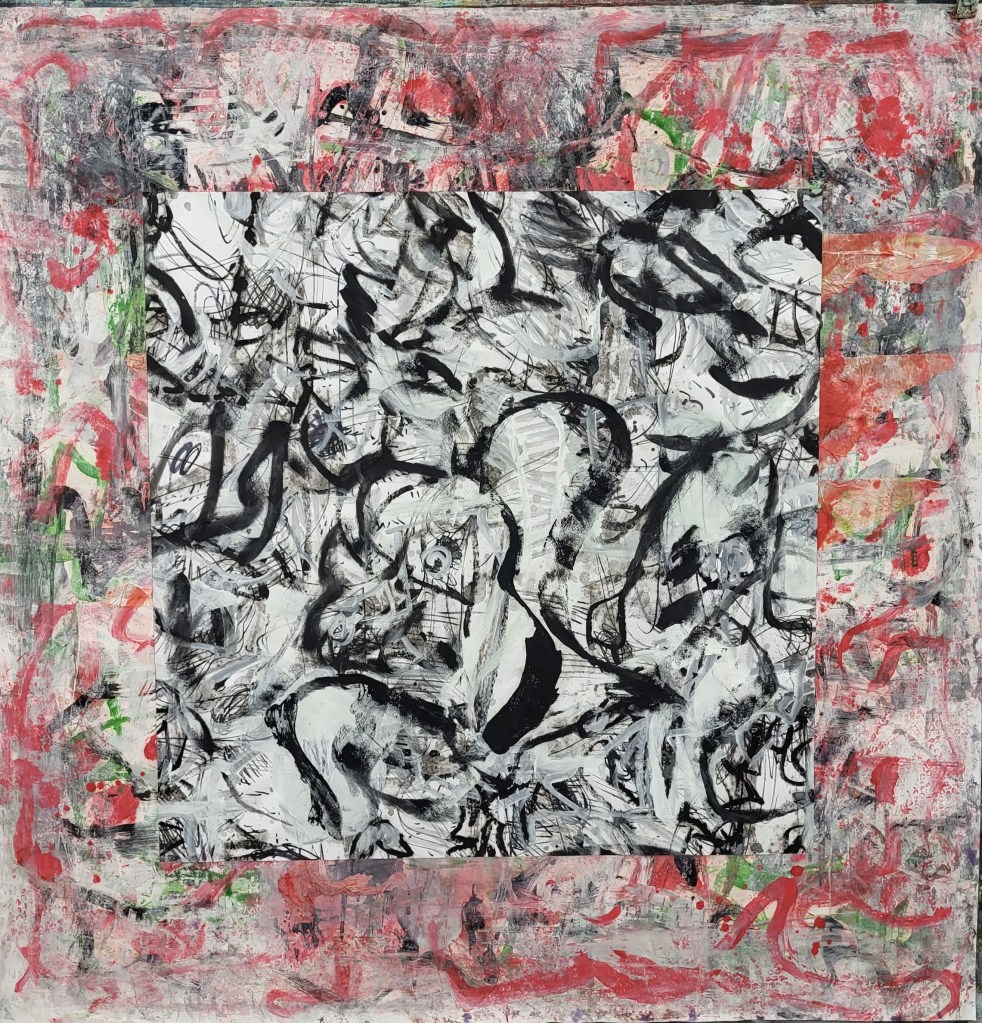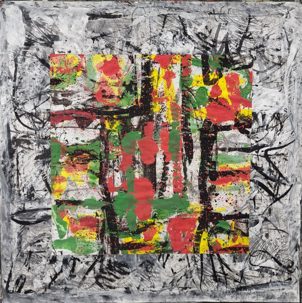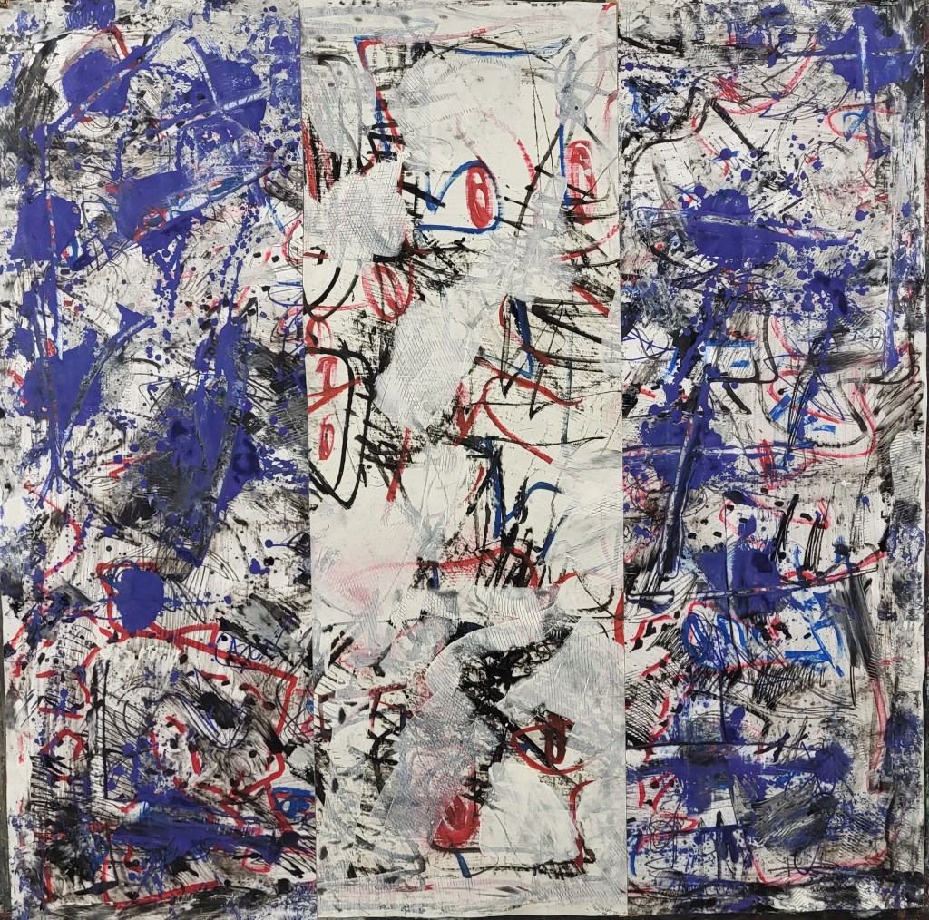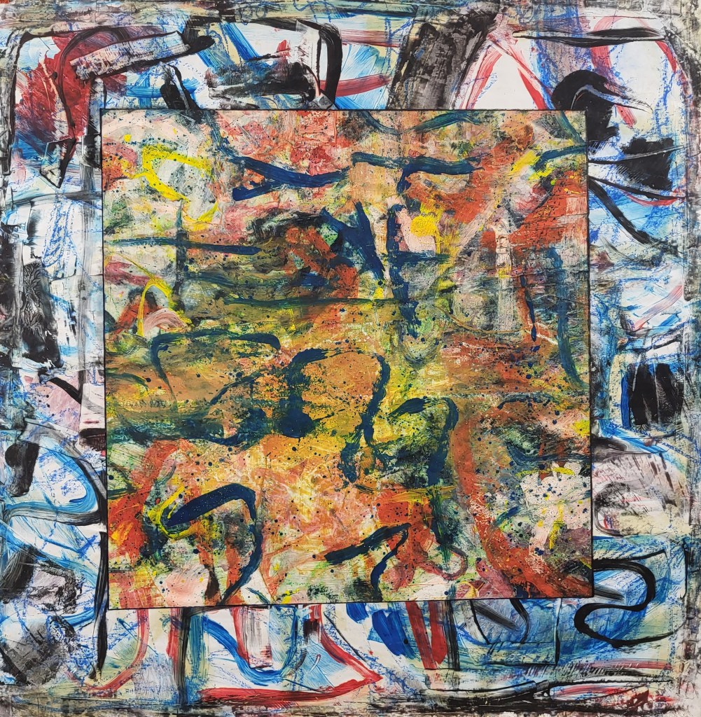 Avec découpe 150x150cm Le format carré est l’occasion d’une égalité entre le haut et le bas, avec trop de ciel, trop de sol, pour donner ma position, marquer ma présence et ne pas pouvoir tricher..