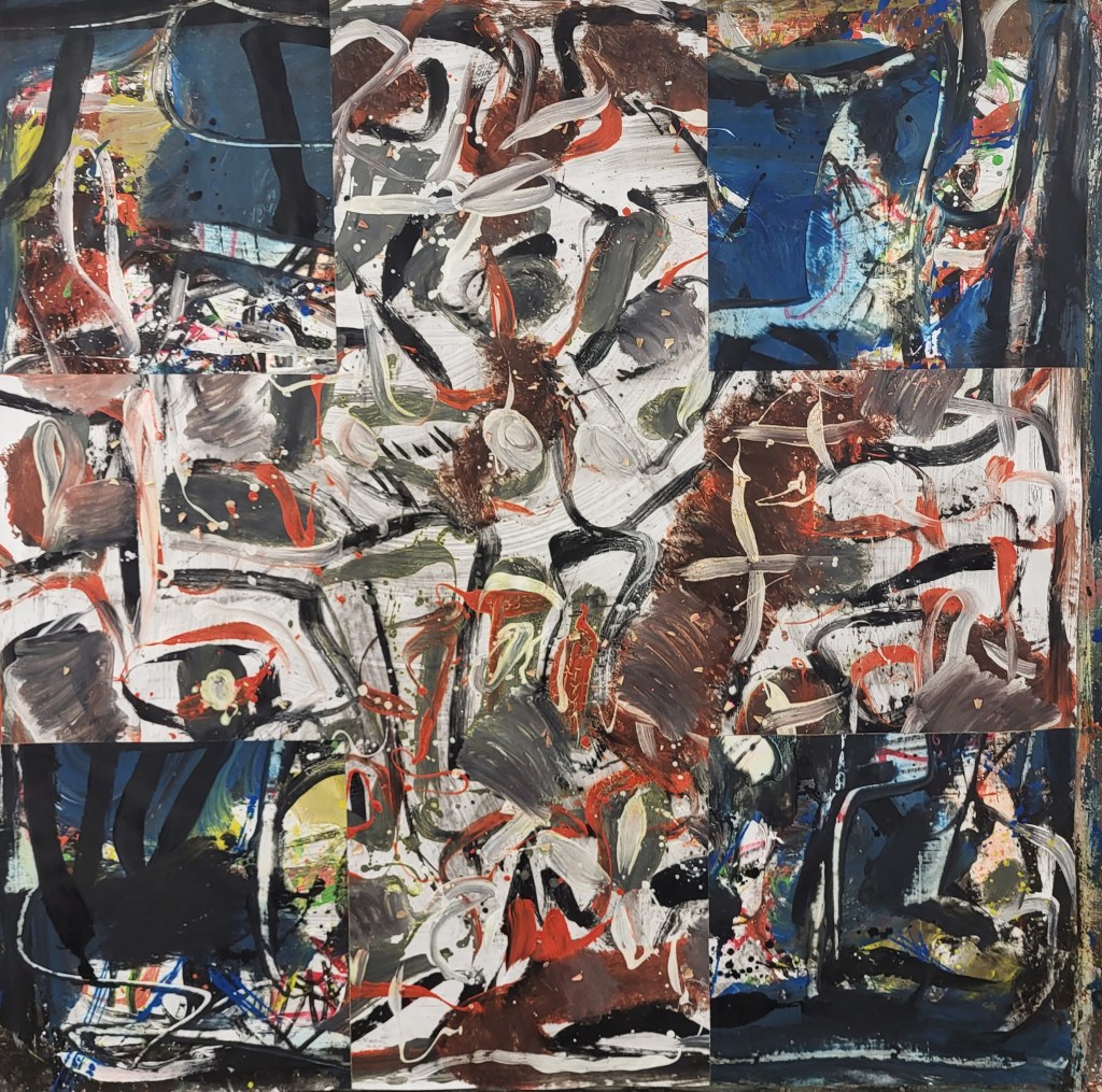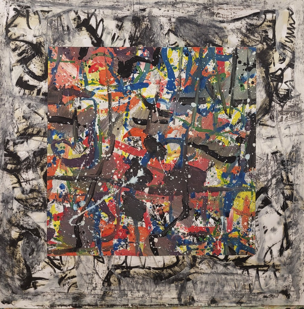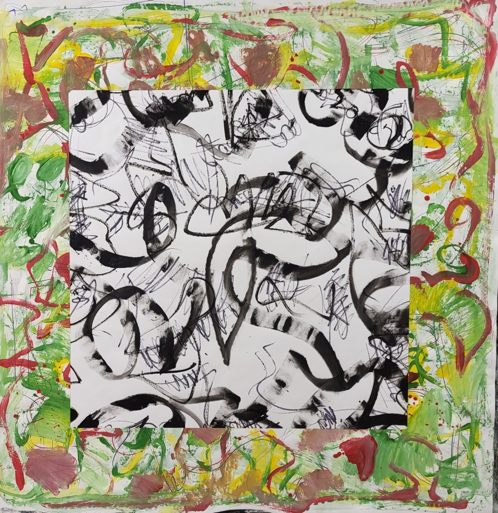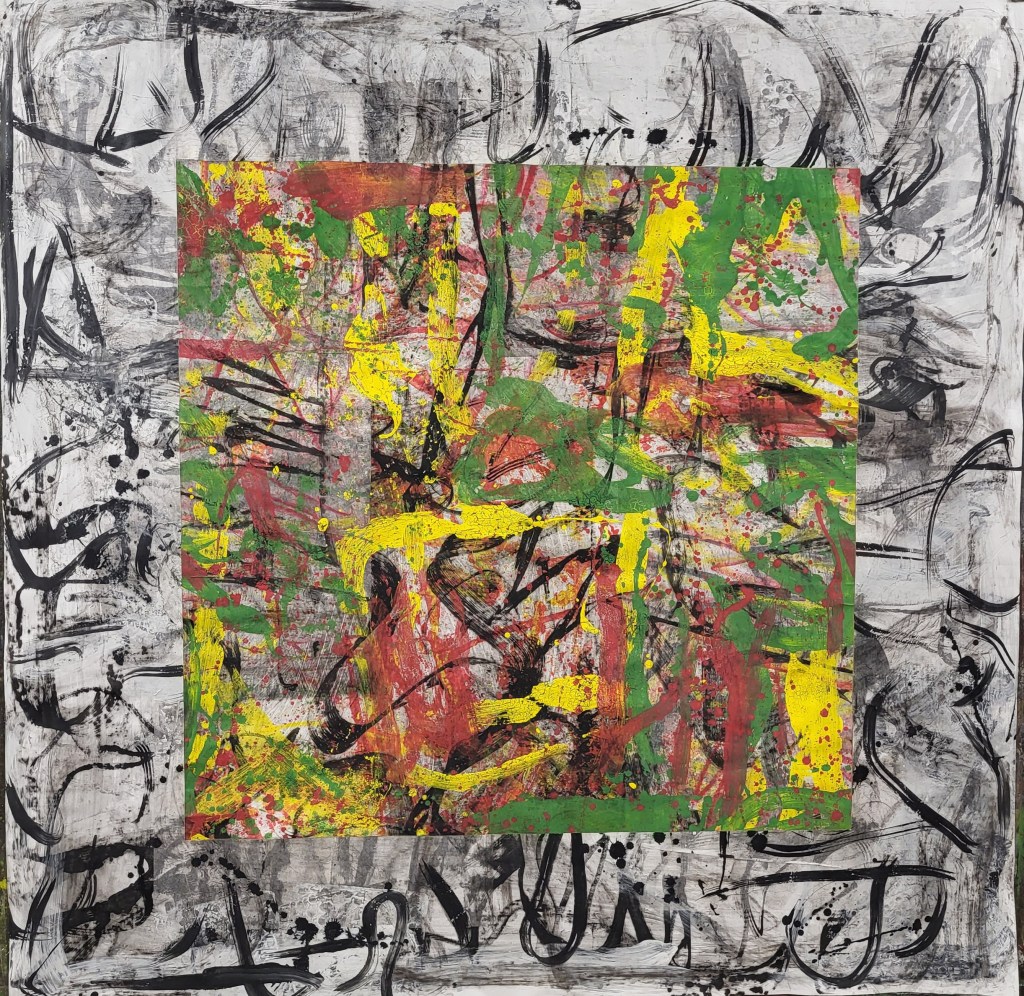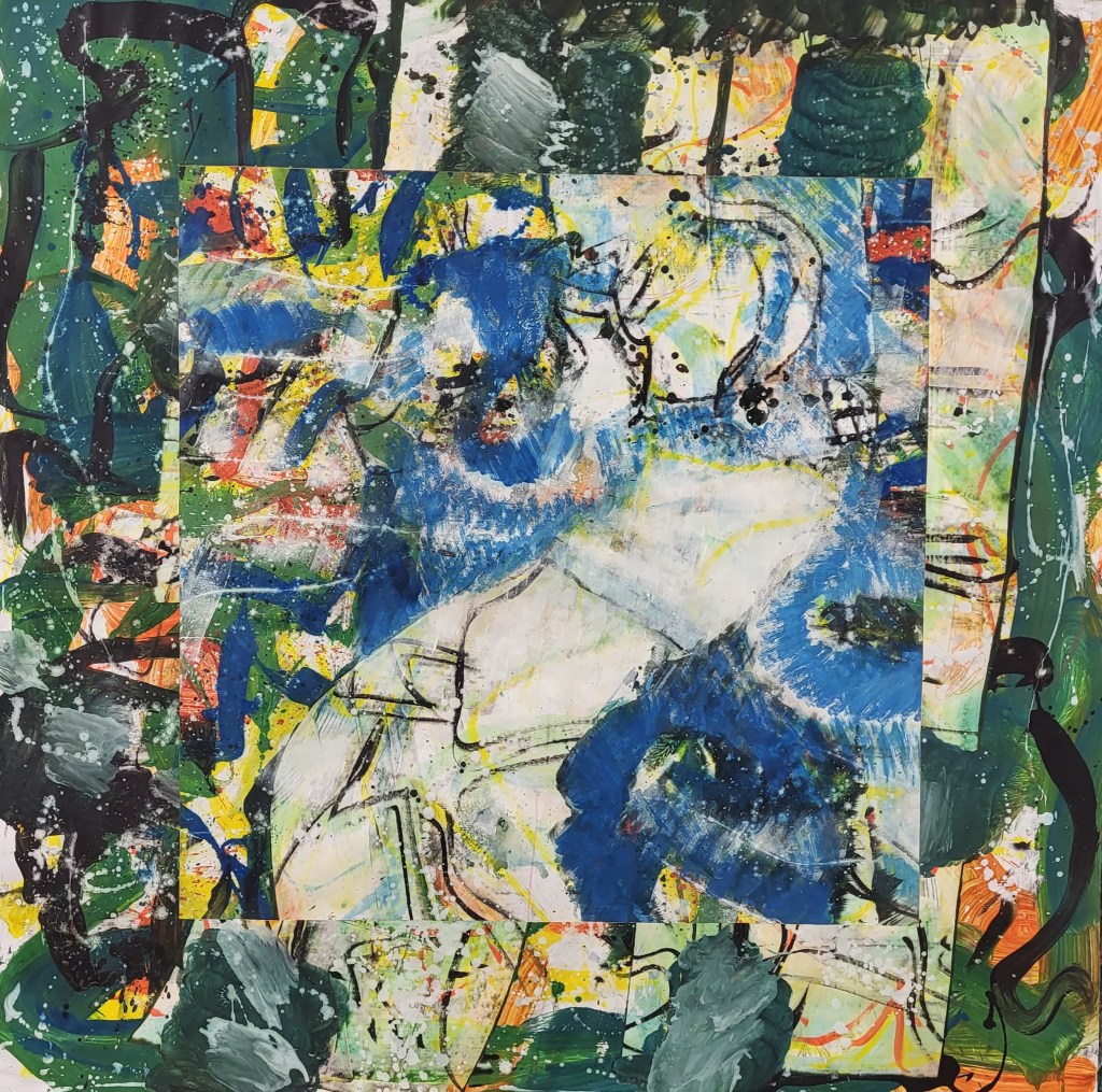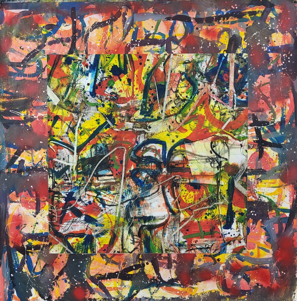 Avec découpe 150x150cm Le format carré est l’occasion d’une égalité entre le haut et le bas, avec trop de ciel, trop de sol, pour donner ma position, marquer ma présence et ne pas pouvoir tricher..