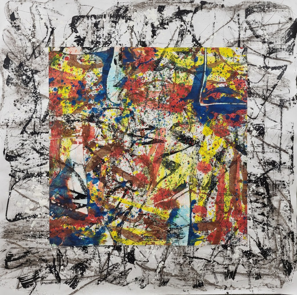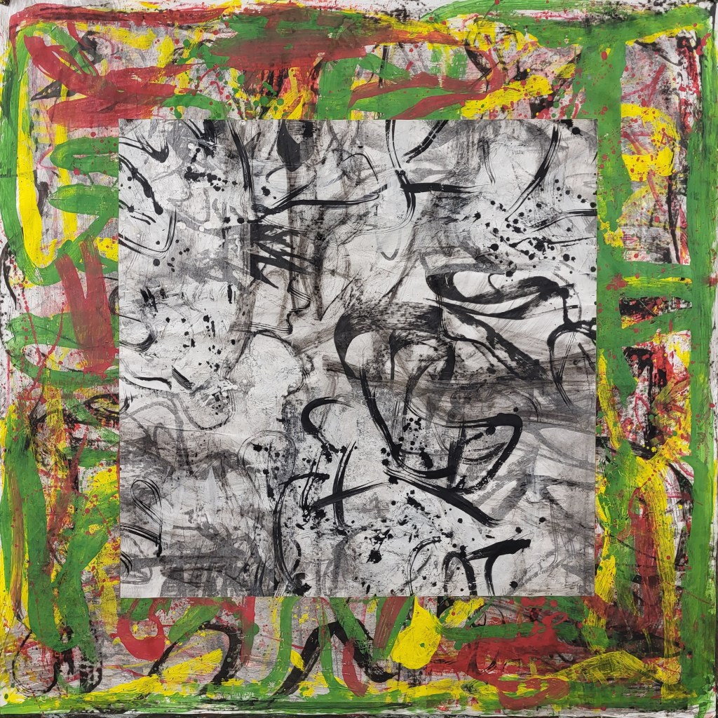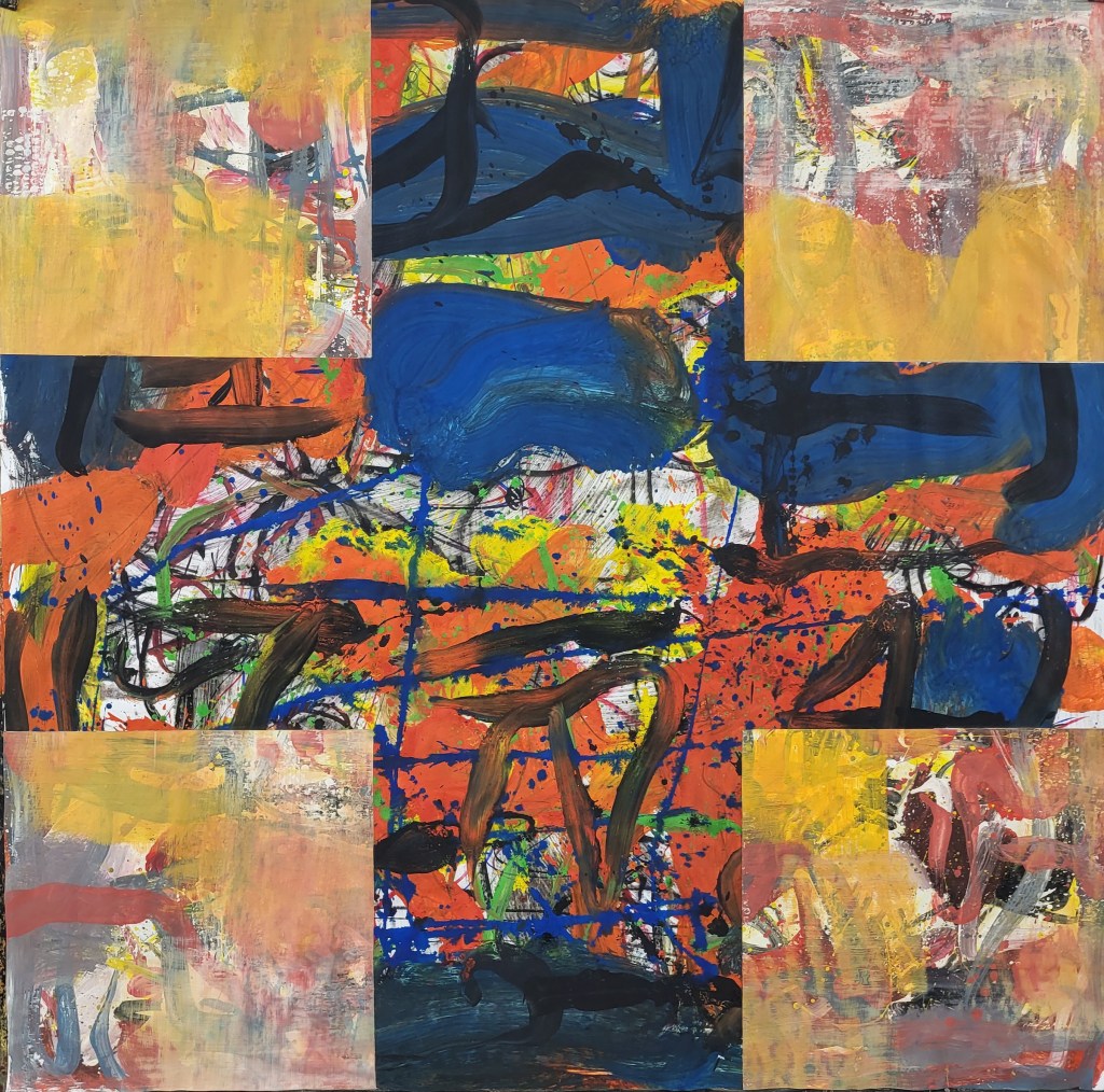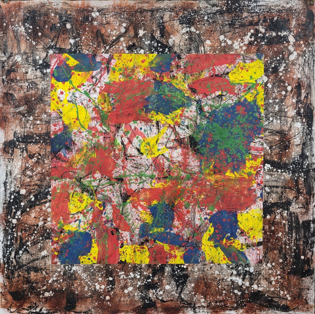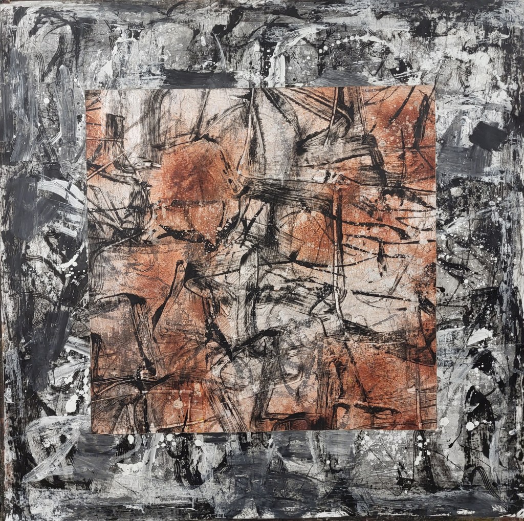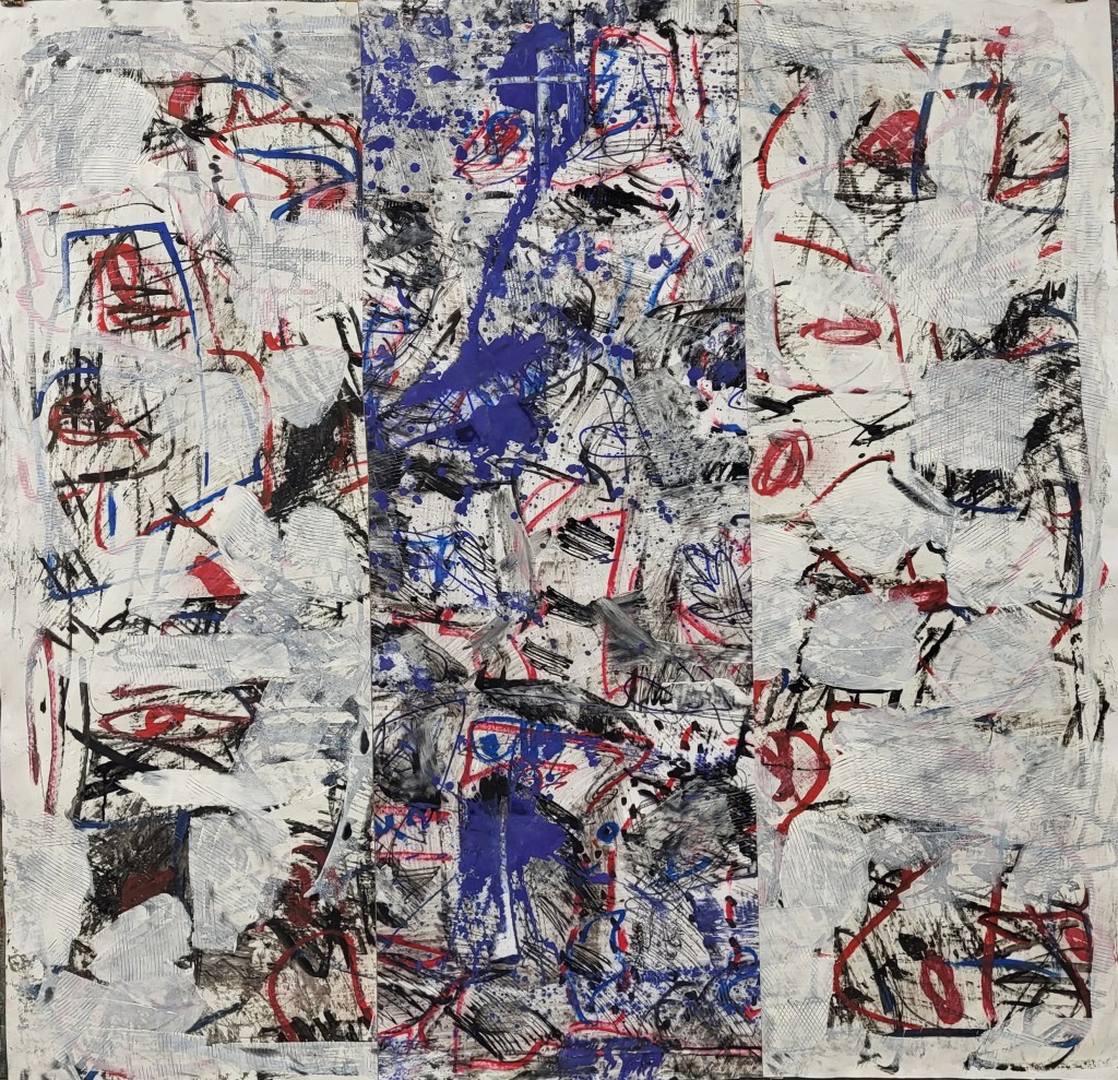 Avec découpe 150x150cm Le format carré est l’occasion d’une égalité entre le haut et le bas, avec trop de ciel, trop de sol, pour donner ma position, marquer ma présence et ne pas pouvoir tricher..