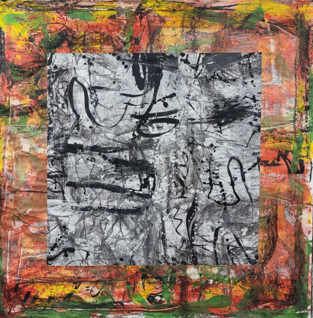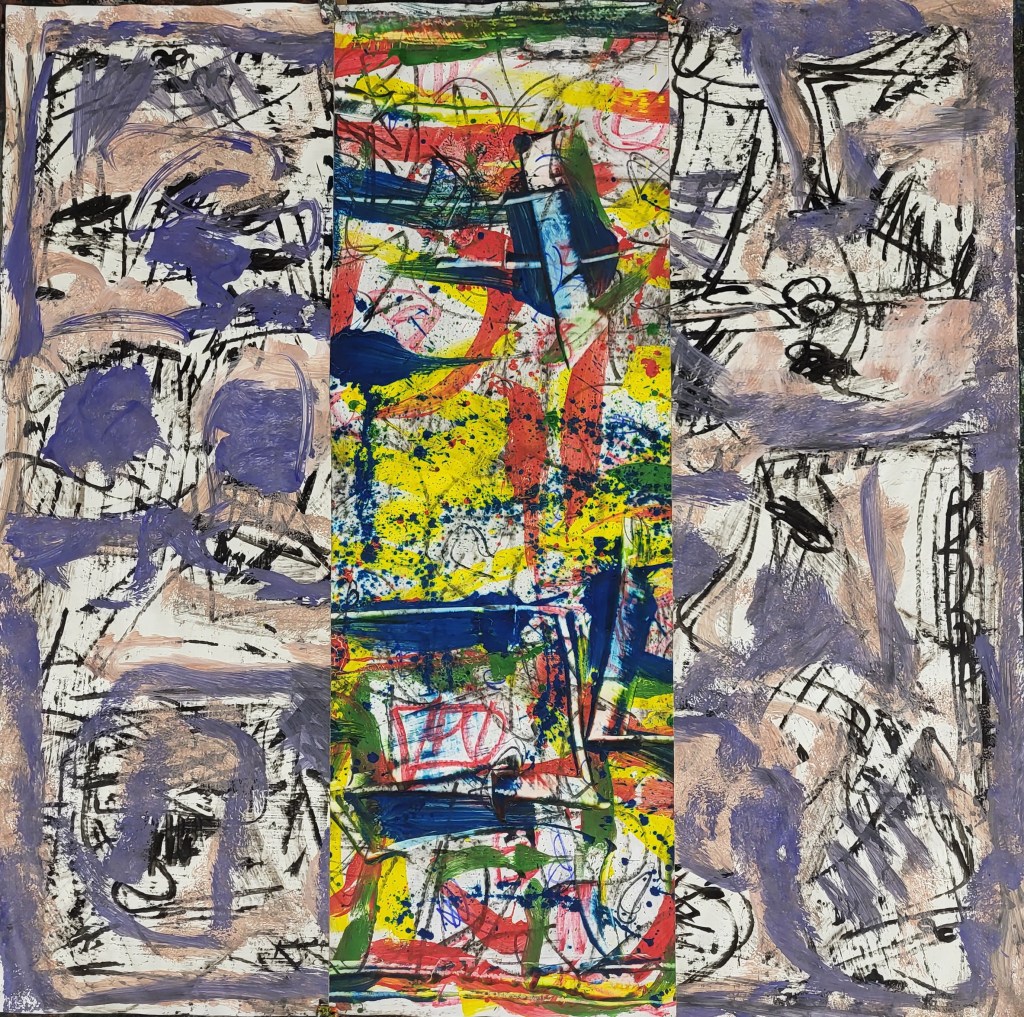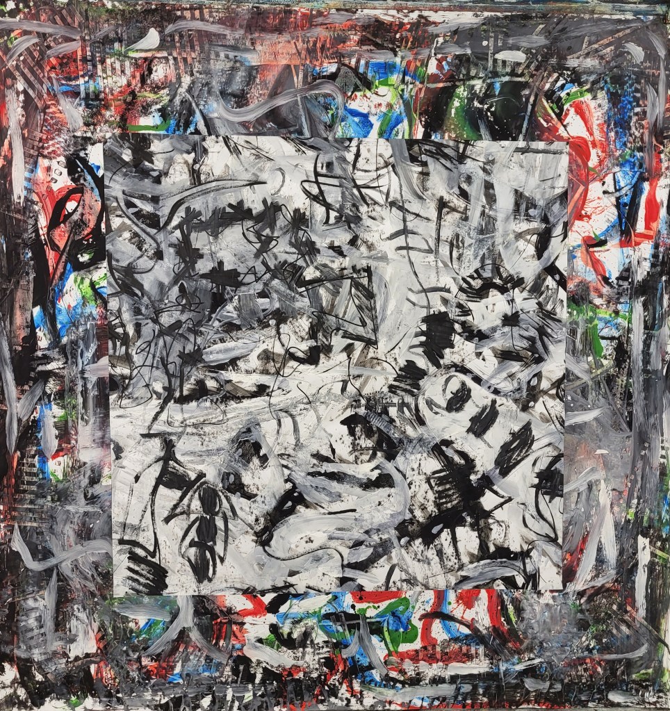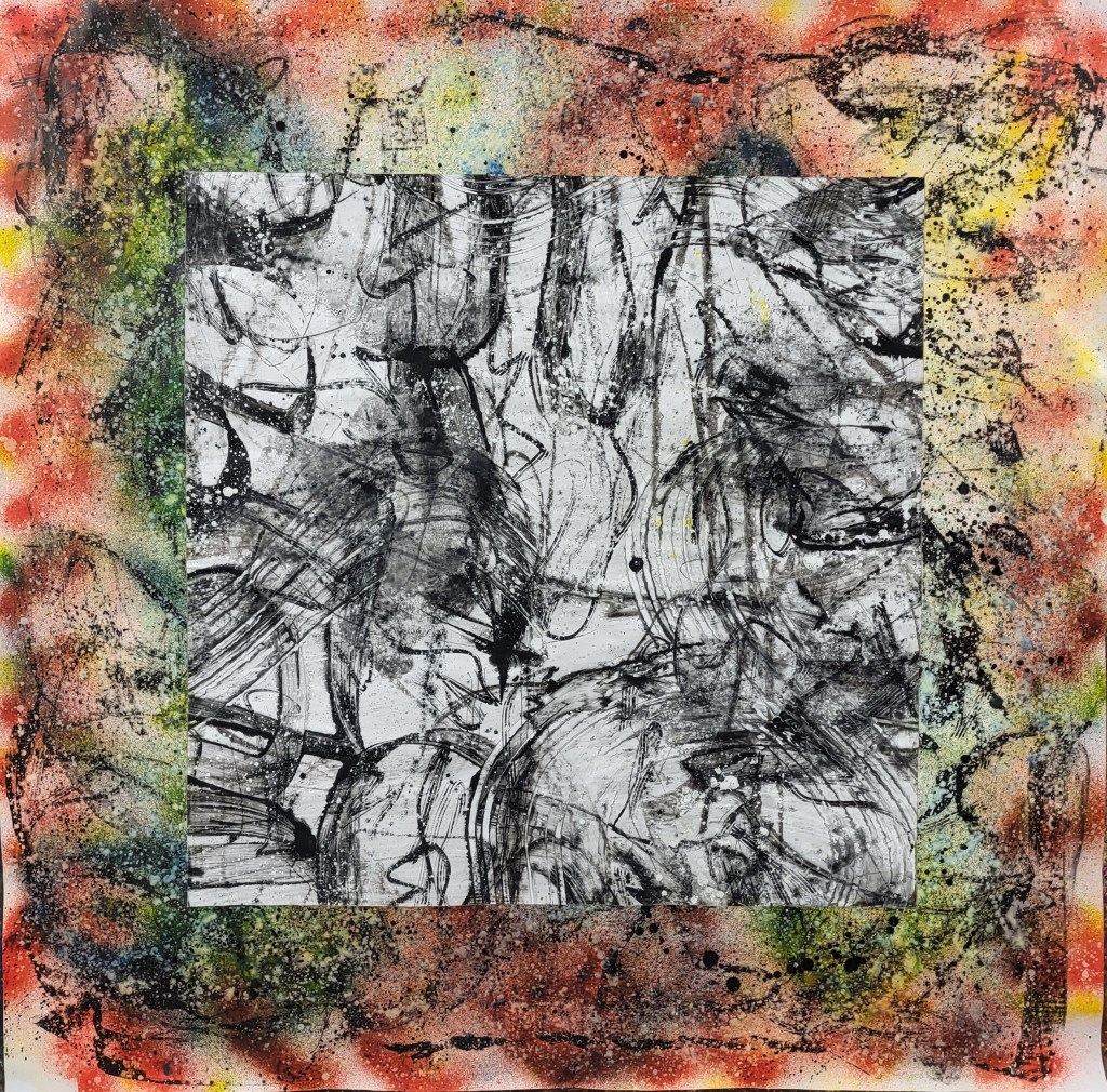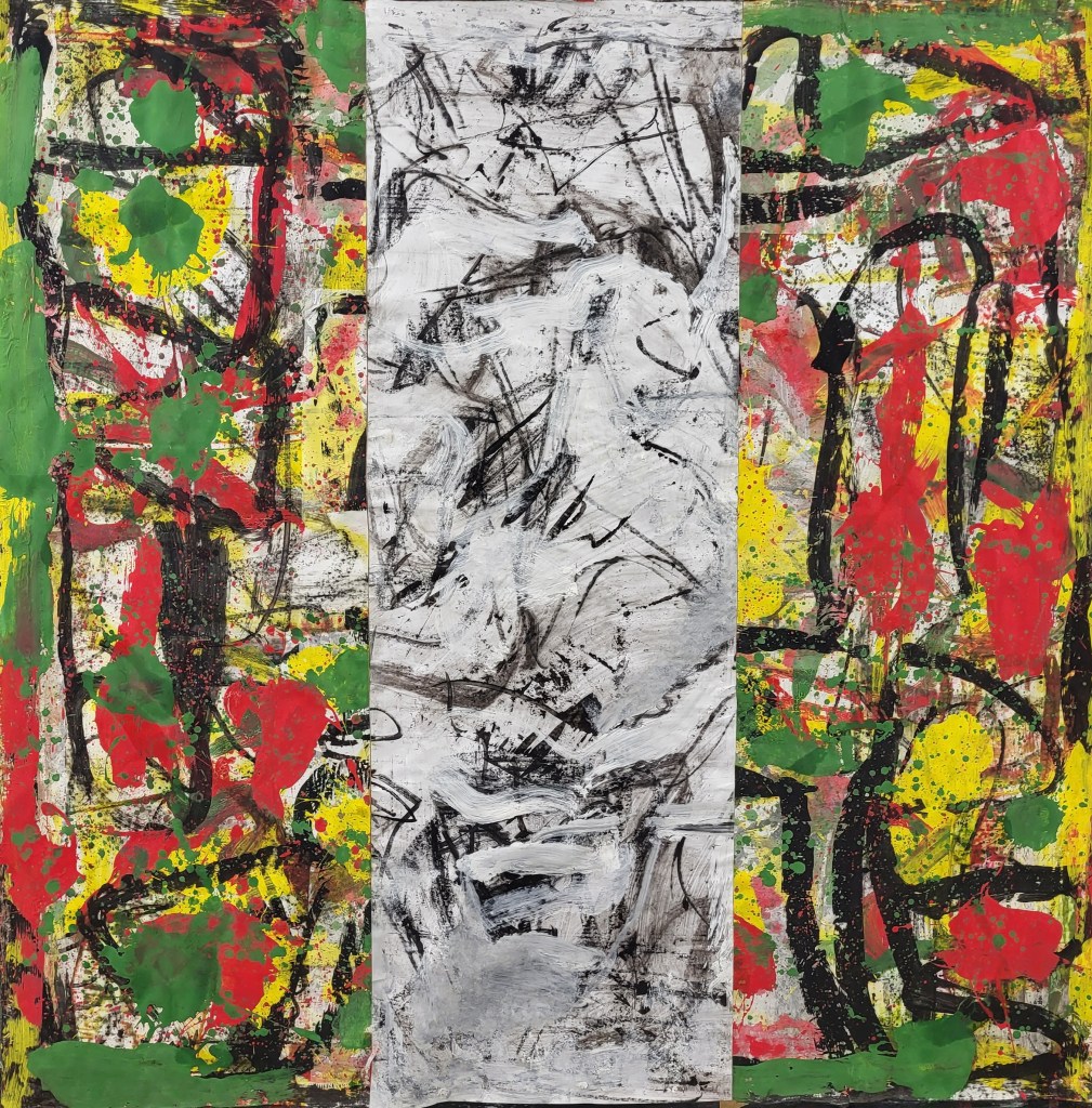 Avec découpe 150x150cm Le format carré est l’occasion d’une égalité entre le haut et le bas, avec trop de ciel, trop de sol, pour donner ma position, marquer ma présence et ne pas pouvoir tricher..