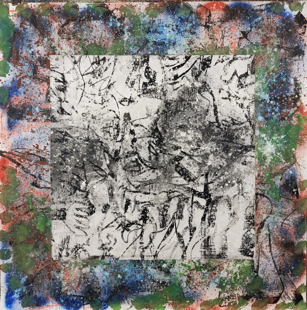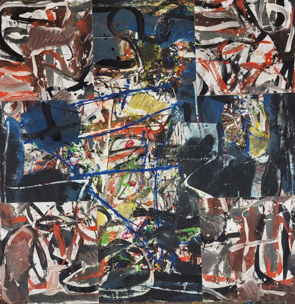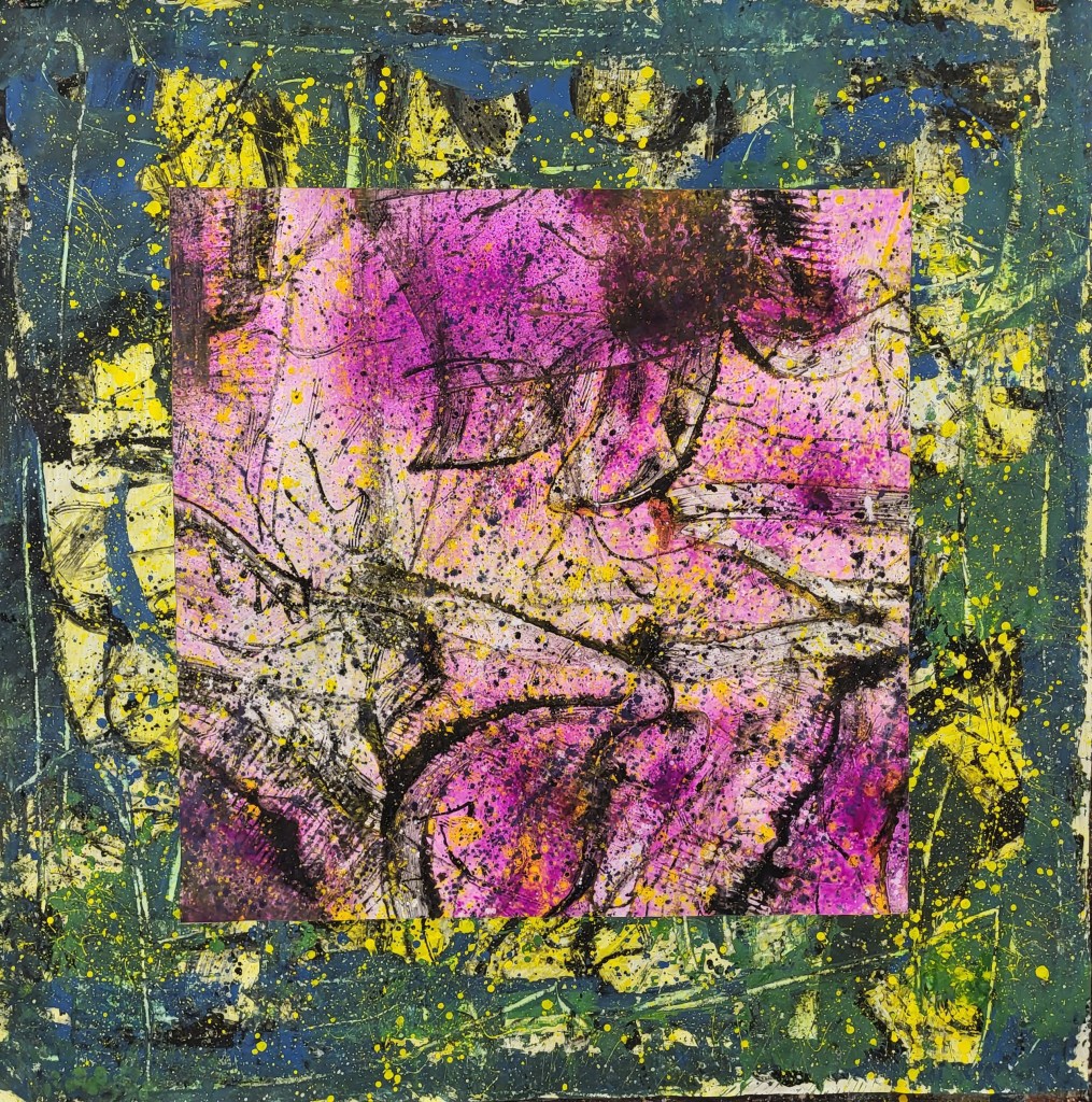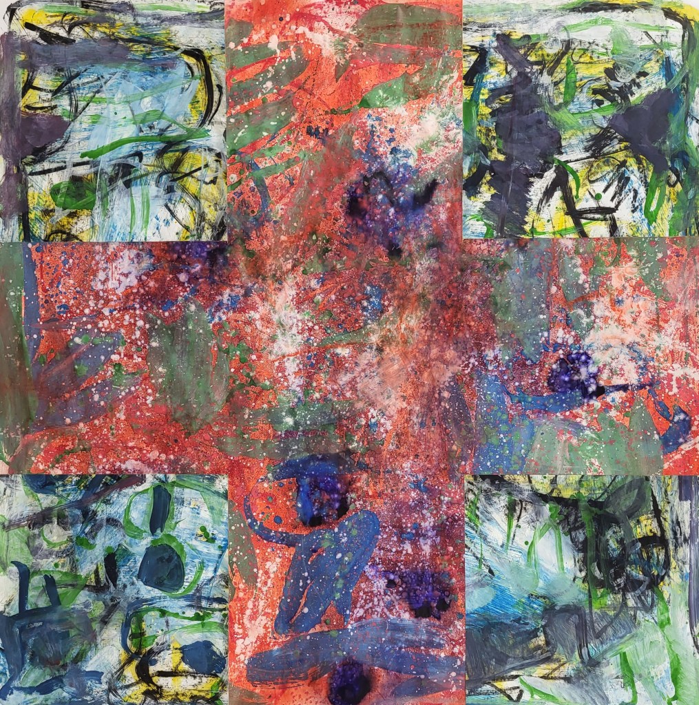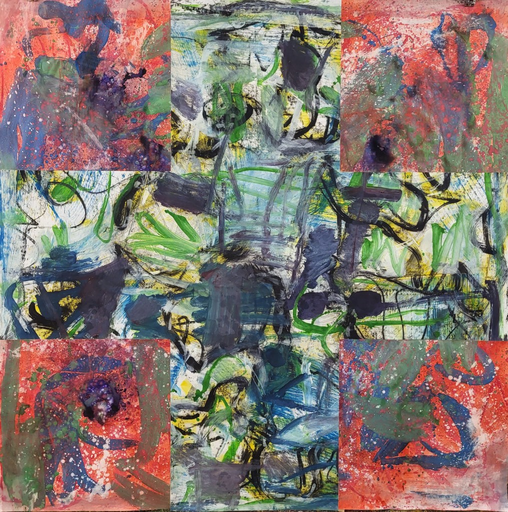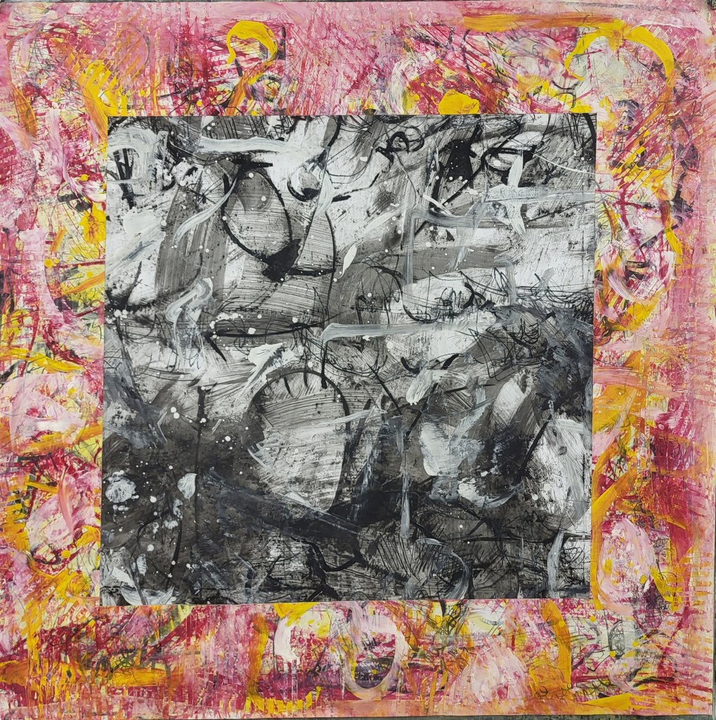 Avec découpe 150x150cm Le format carré est l’occasion d’une égalité entre le haut et le bas, avec trop de ciel, trop de sol, pour donner ma position, marquer ma présence et ne pas pouvoir tricher..